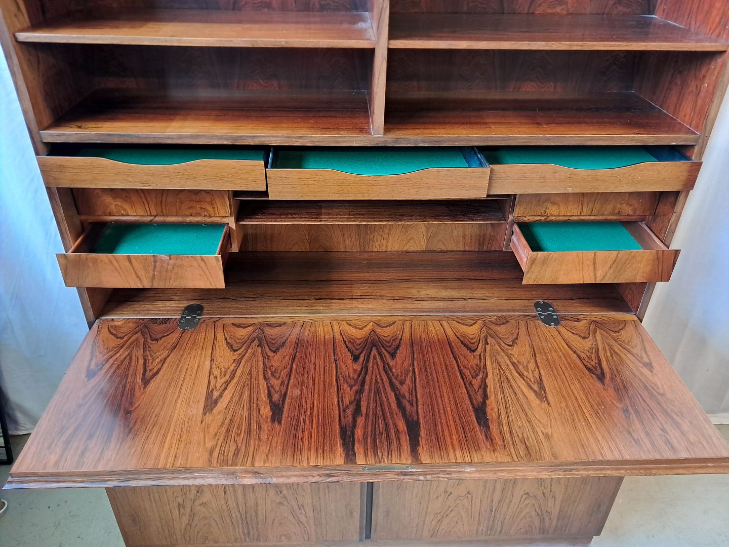 Omann Jun. 2 Delt reolsektion i fineret palisander, fra 1960erne. Den har brugsspor. Højde 187cm Bredde 120cm Dybder 43cm og 29cm Emne nummer: 77928