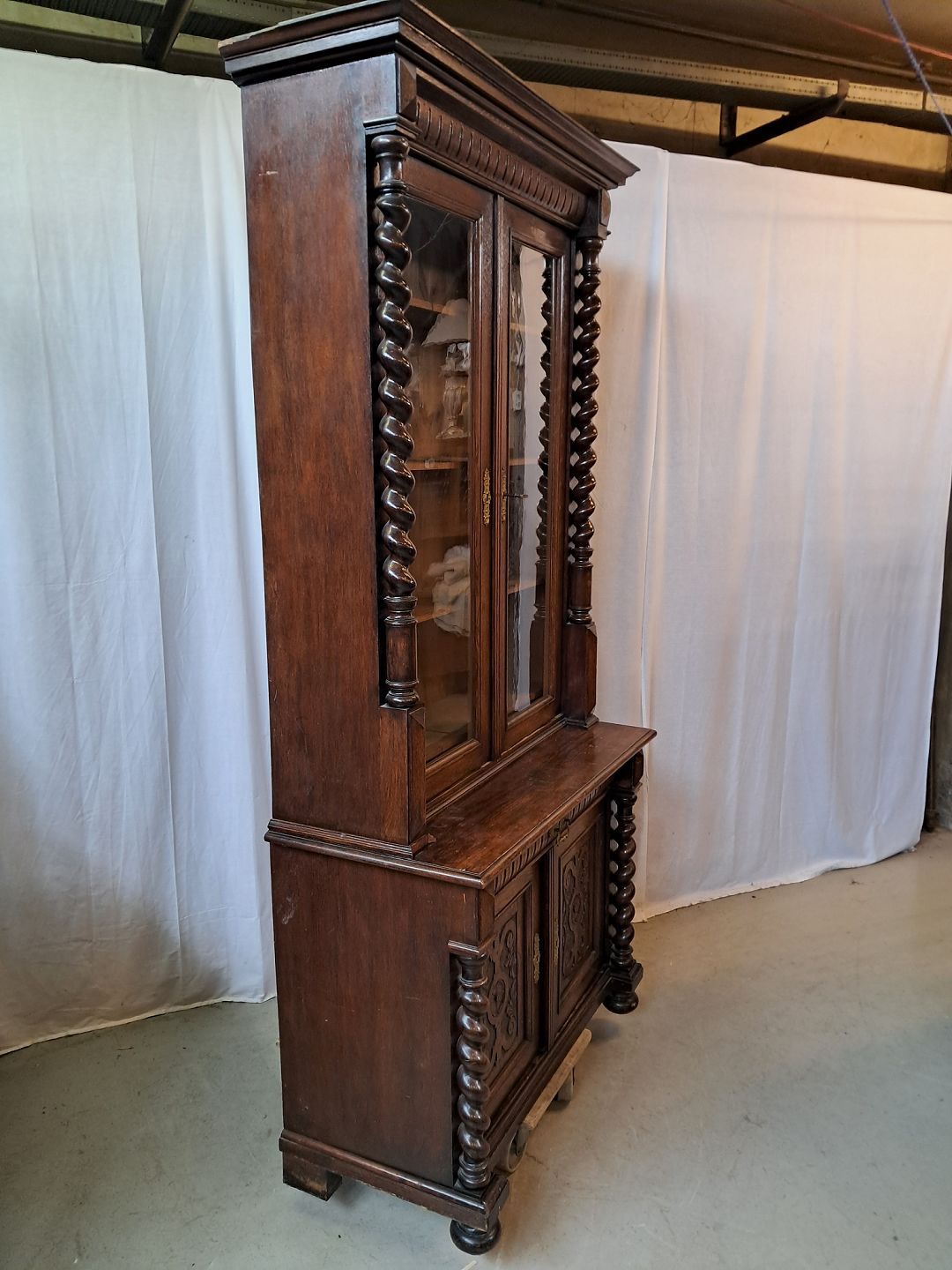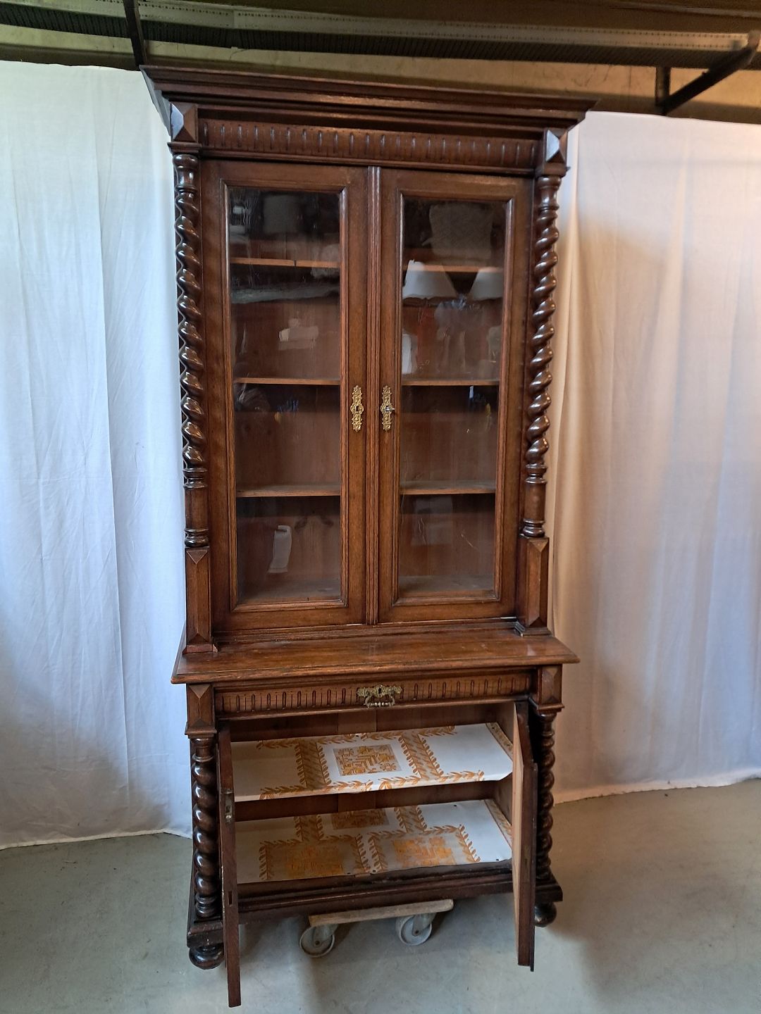 Skab med vitrineoverdel i massivt og fineret egetræ, fra 1900erne. De har brugsspor og mangler et par lister. (se foto) Højde 220cm Bredde 105cm Dybder 48cm og 25cm Emne nummer: 77940