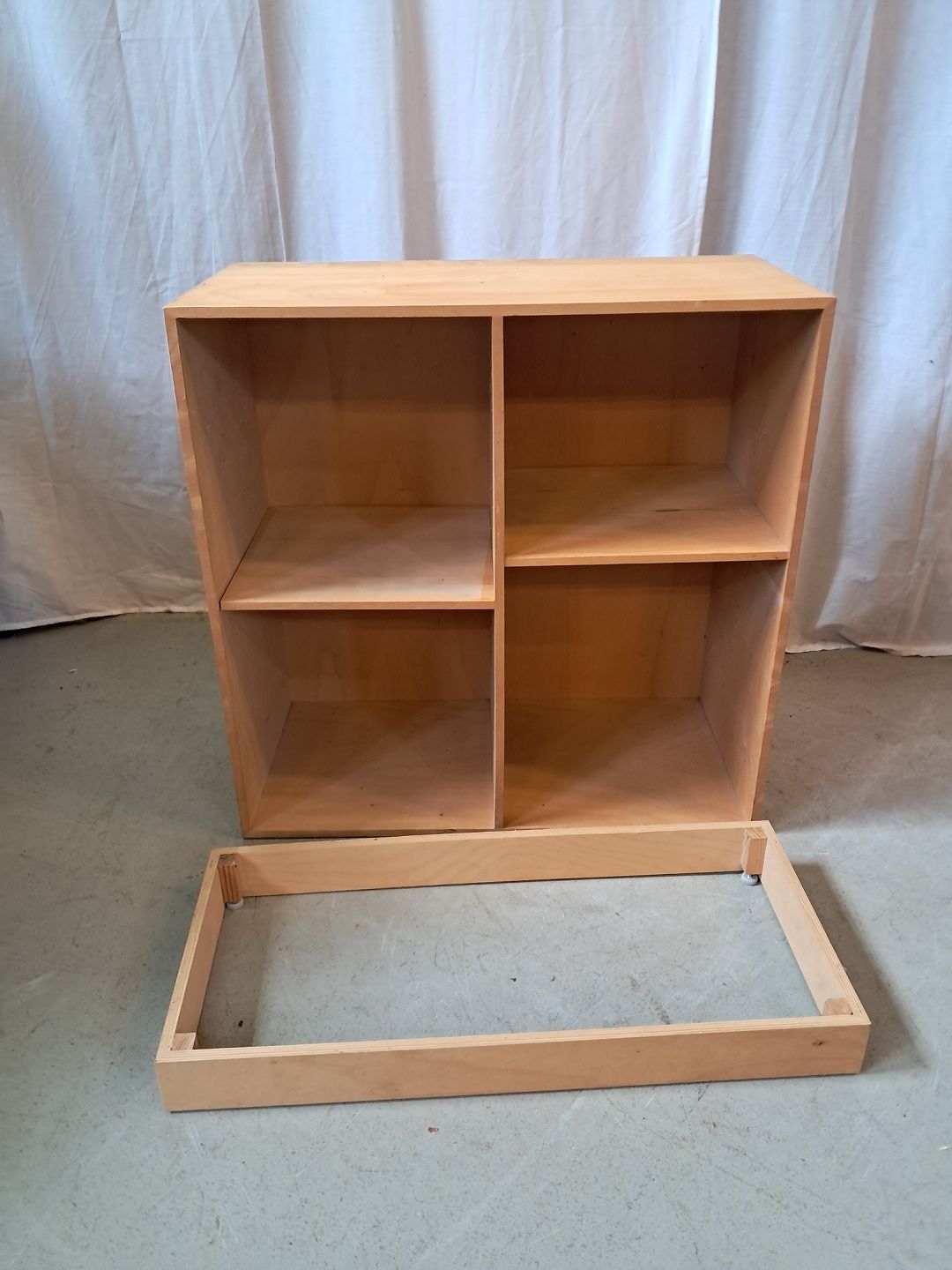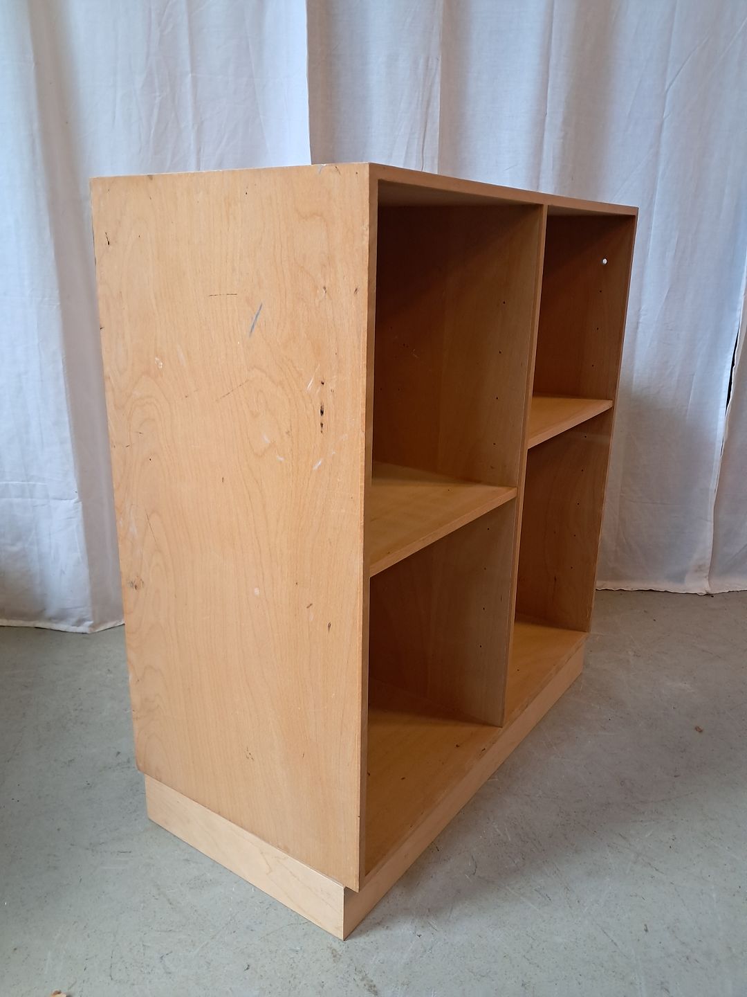 Reolkasse i bøge-krydsfiner med sokkel. Den har en del brugsspor. Højde 70cm Bredde 70cm Dybde 35cm Sokkelhøjde 7cm Emne nummer: 77942