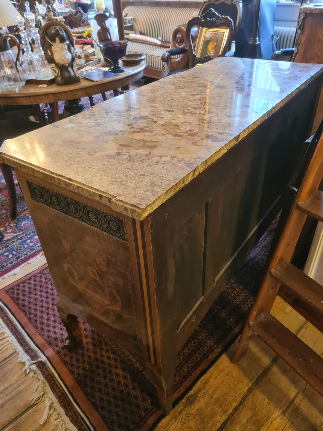 Antik kommode fra sidst i 1800 tallet i rokokostil med løstliggende marmorplade på toppen. Fremstår pæn og funktionsdygtig dog med enkelte finér skader øverst på skufferne (billede) og umiddelbart uden nøgle.
