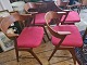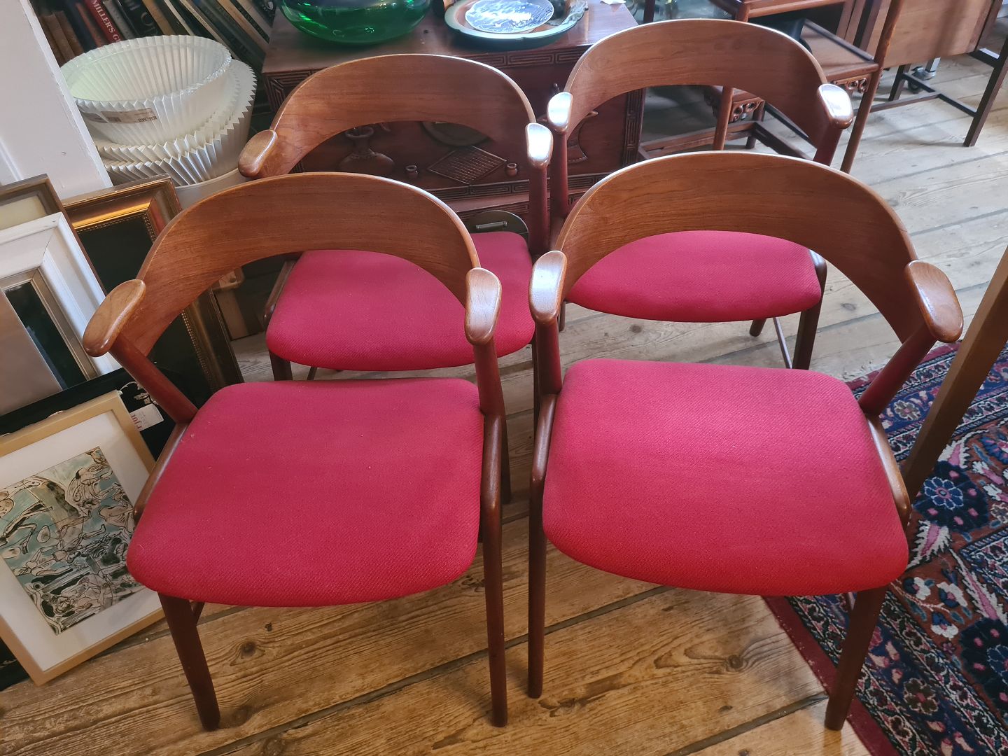 4 spisebordsstole fra 1960'erne designet af Kai Kristiansen. Her i teak med stofbetrukket sæde. Fremstår pæne og velholdte uden nævneværdige brugsspor. Højde 76 cm. Bredde 53 cm. Dybde 51 cm. Sædehøjde 46 cm. Emne nummer: 81039
