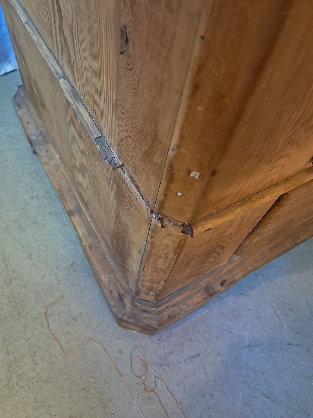 Skab i massivt fyrretræ, fra 1910erne. Det har brugsspor og defekte lister. Højde 183cm Bredde 92cm Dybde 45cm Emne nummer: 77961