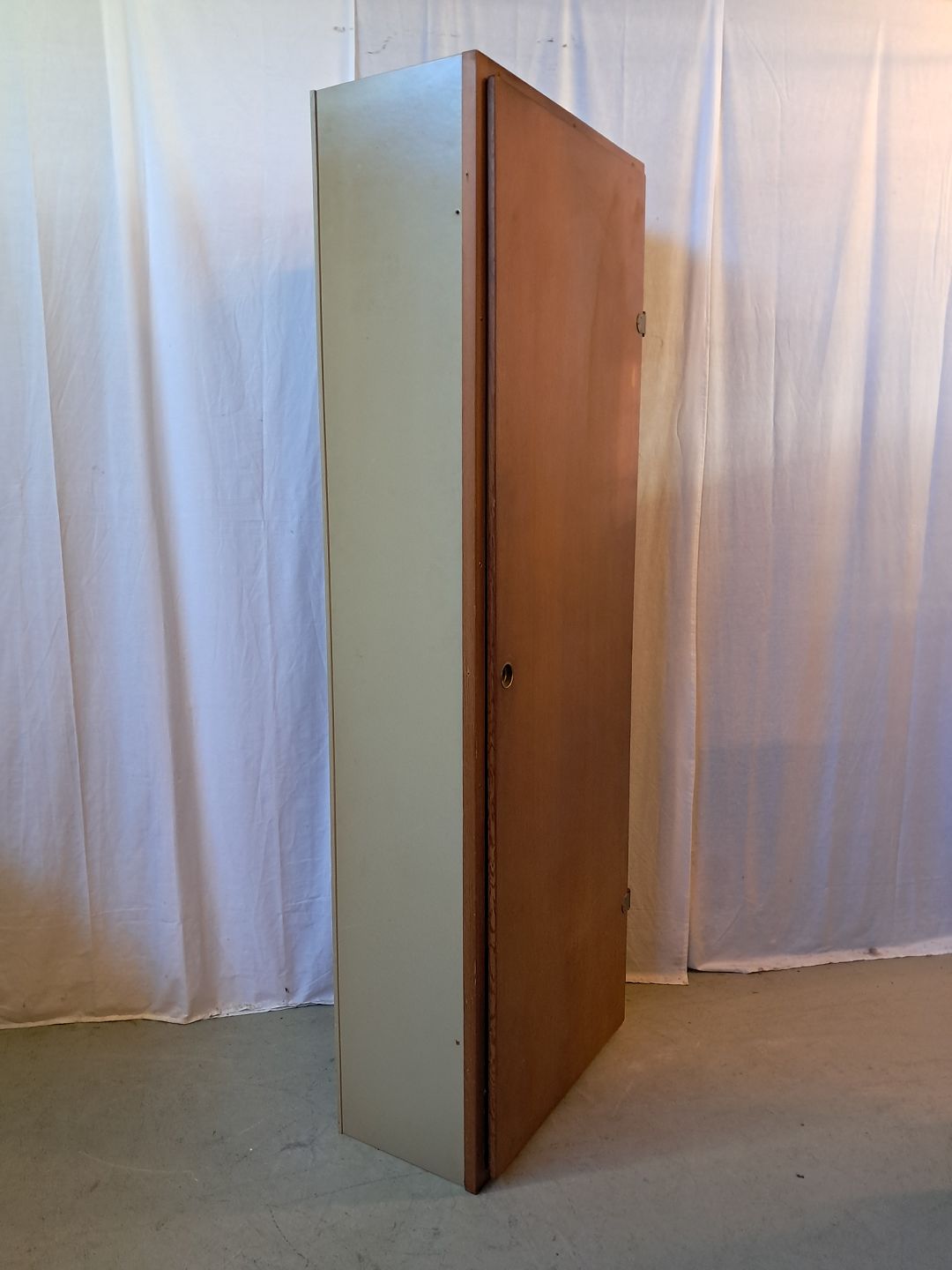 Boligens byggeskab fra 1960'erne med låge i Oregon pinem, designet af Børge Mogensen og Grethe Meyer. Det har brugsspor, og lågen ikke helt i, og der medfølger ikke sokkel. Højde 199cm. Bredde 69cm Dybde 39cm Emne nummer: 77984