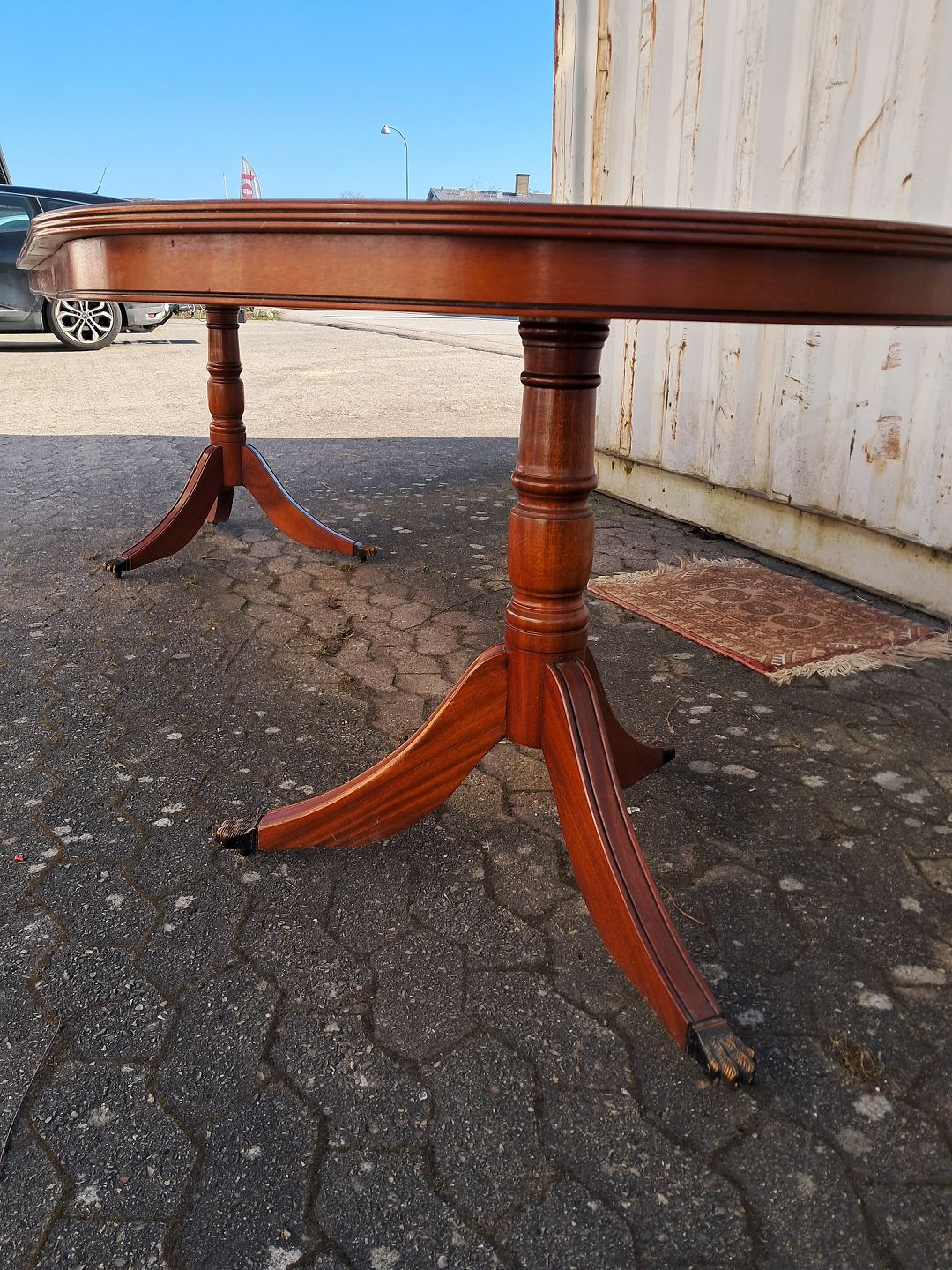 Two pillar table i fineret mahogni, fra 1990erne. Det har brugsspor og der medfølger 2 tillægsplader. Højde 76cm Bredde 100cm Længde 162cm Længde med tillægsplader 270cm Emne nummer: 77986