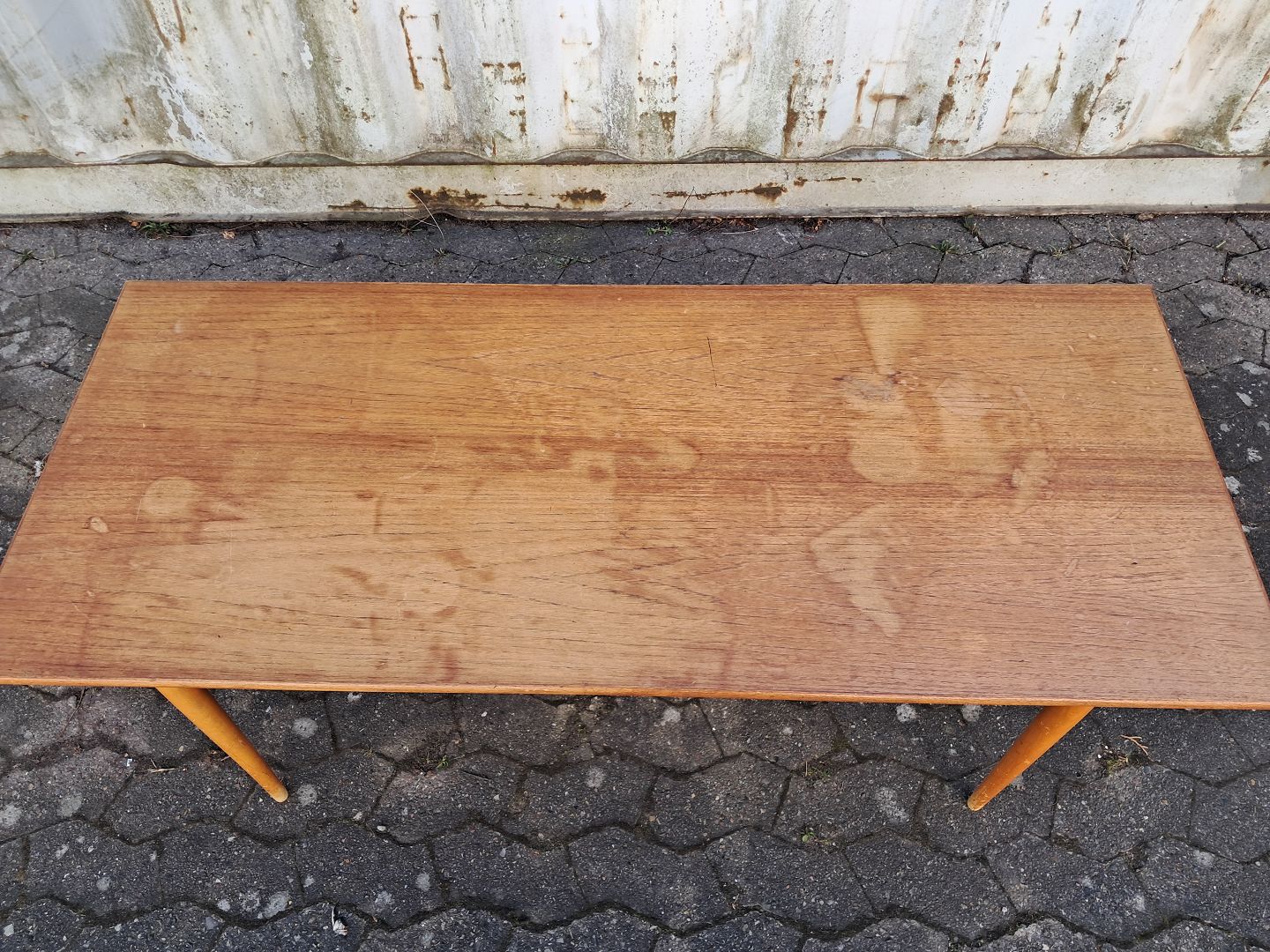 Sofabord i fineret teaktræ med ben i massivt bøgetræ, fra 1960erne. Bordpladen har brugsspor. Højde 52cm Bredde 55cm Længde 130cm Emne nummer: 77990
