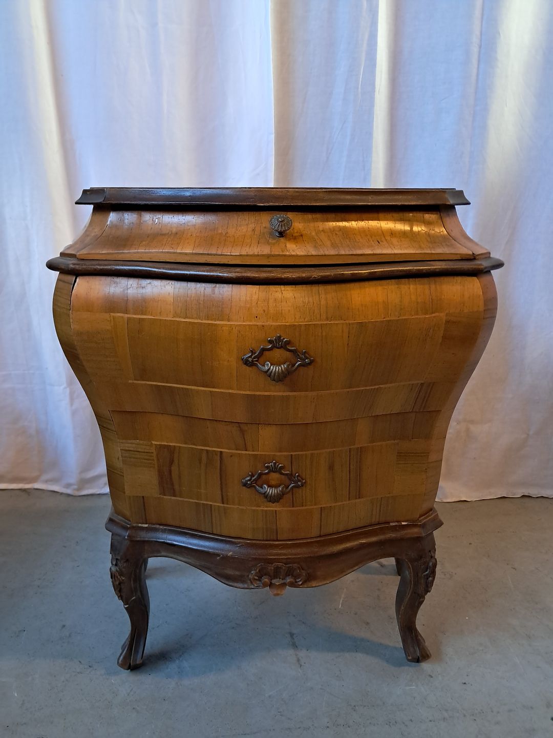 Rokoko kommode i fineret nødetræ, fra 1980erne. Den har brugsspor. Højde 68cm Bredde 64cm Dybde 36cm Emne nummer: 78004
