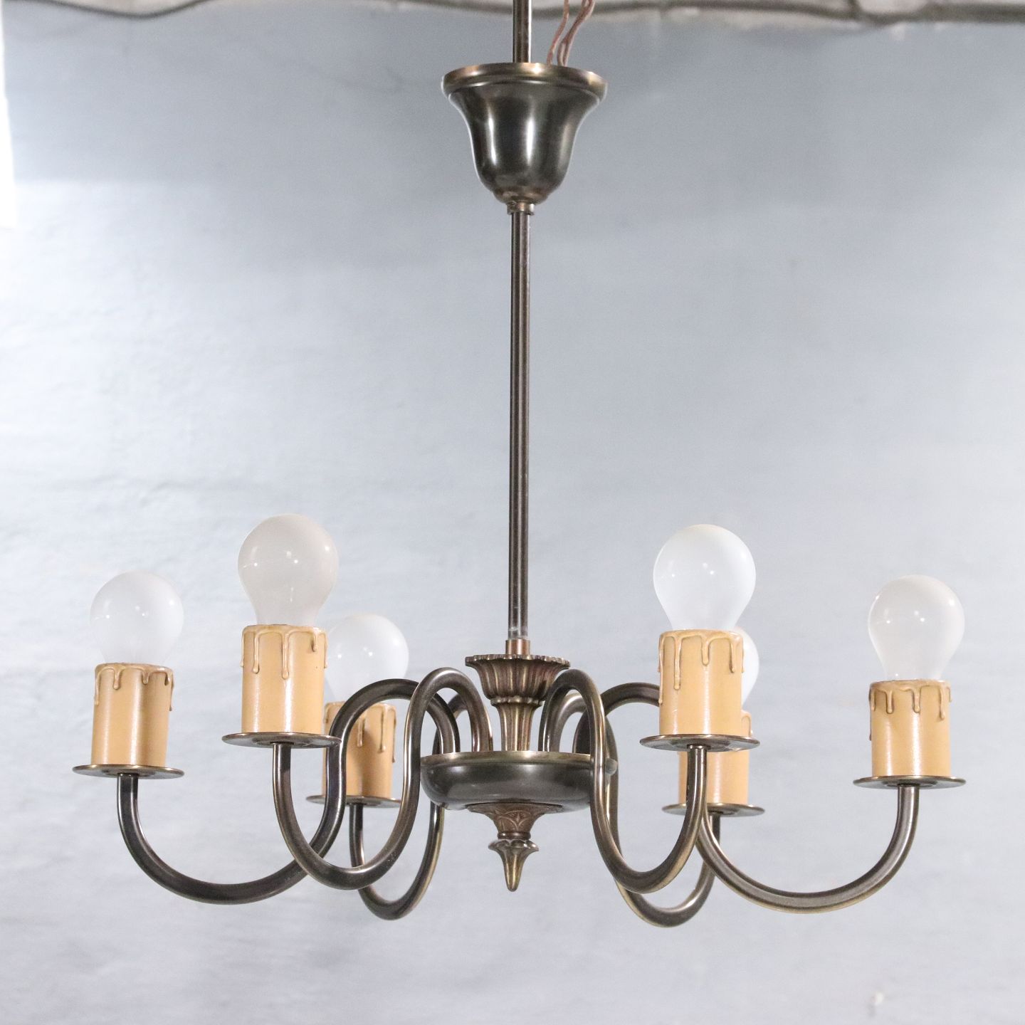 6-armet lysekrone i bruneret messing, 57 cm i diameter, 1940-1950