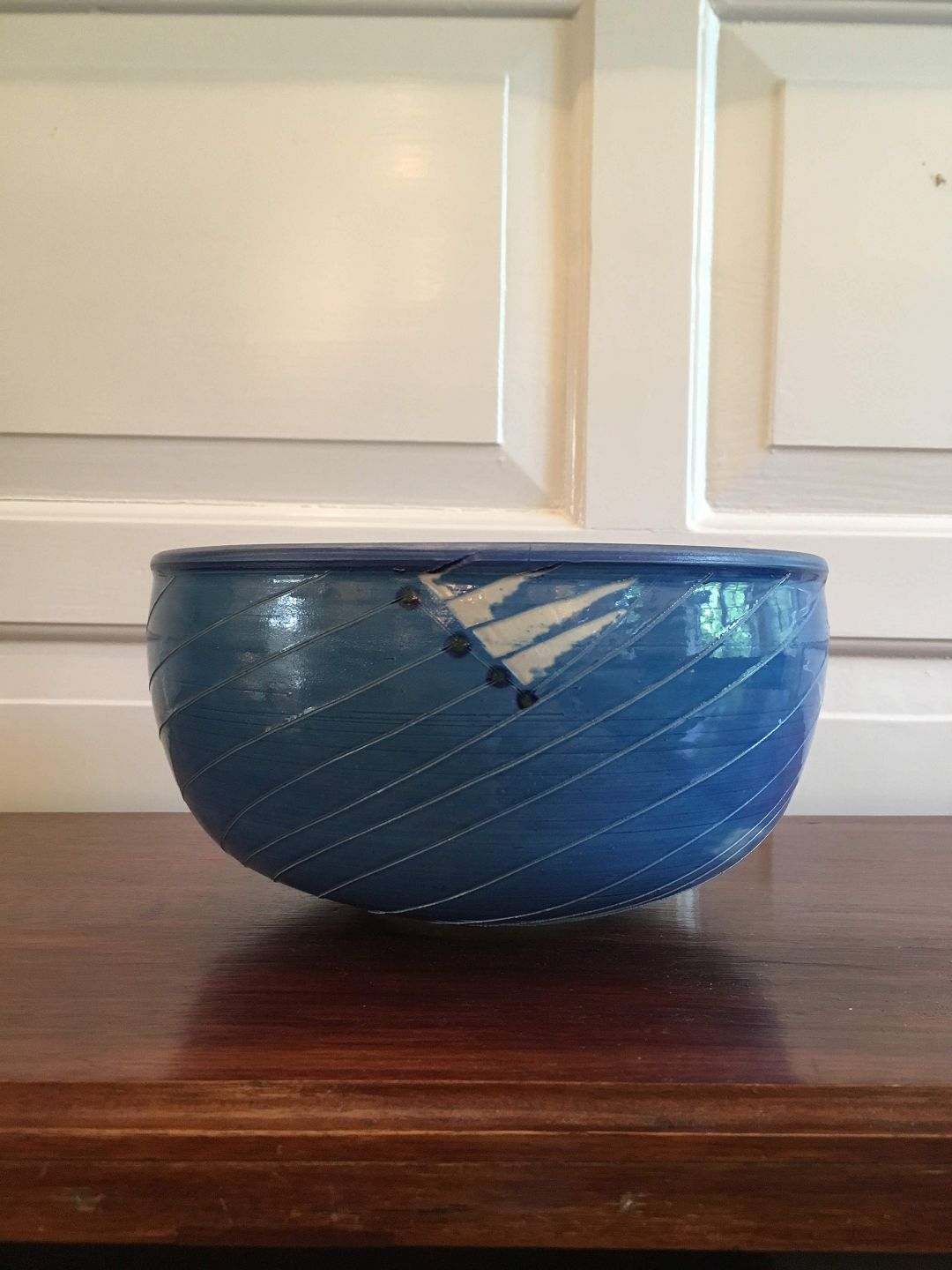 Skål i blåglaseret stentøj med indridsninger i skærven, unika designet af Jane Bailey, højde 12,9 cm, diameter 24 cm Emne nummer: 50009