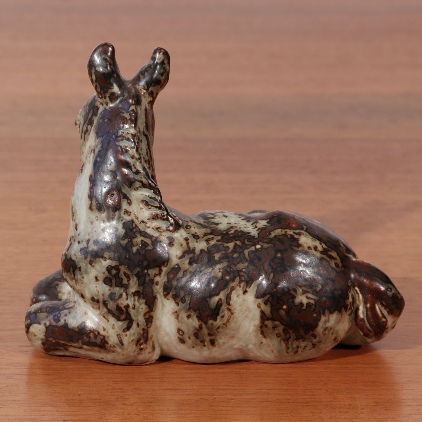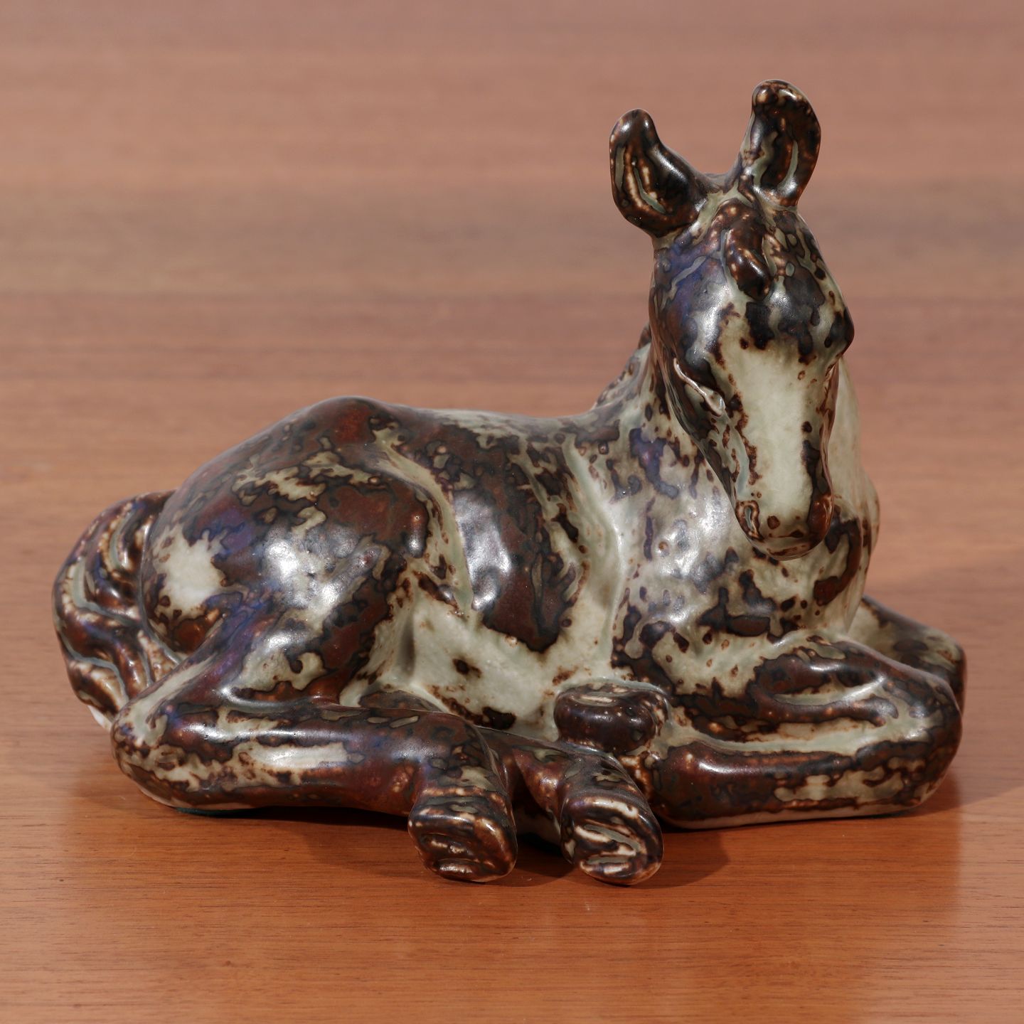 Knud Kyhn (f.1880-d.1969) figur af liggende føl i stentøj glaseret med Sung glasur. Lavet hos Den kgl. Porceænsfabrik mellem 1974-1978.