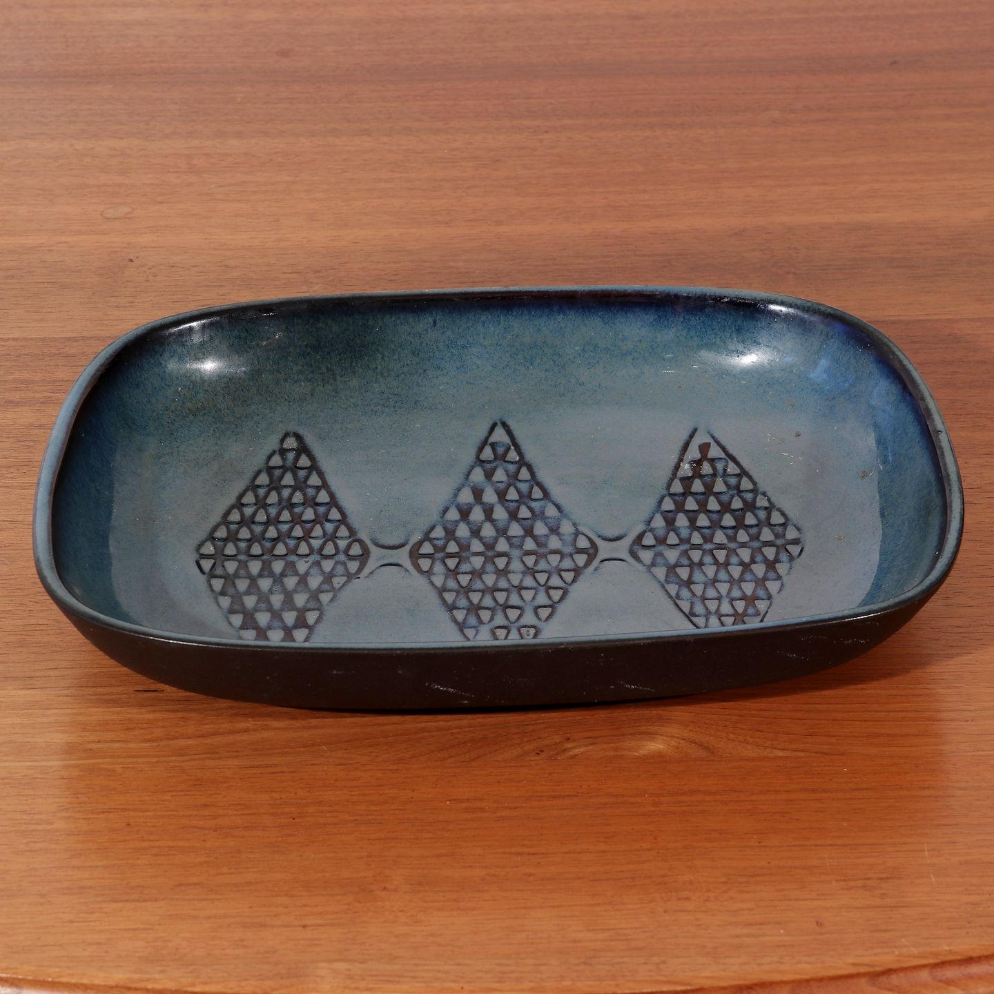 Søholm fad i glaseret stentøj produceret mellem 1960-1970. Højde 6,5 cm, bredde 37,5 cm, bredde 28 cm Emne nummer: 50408
