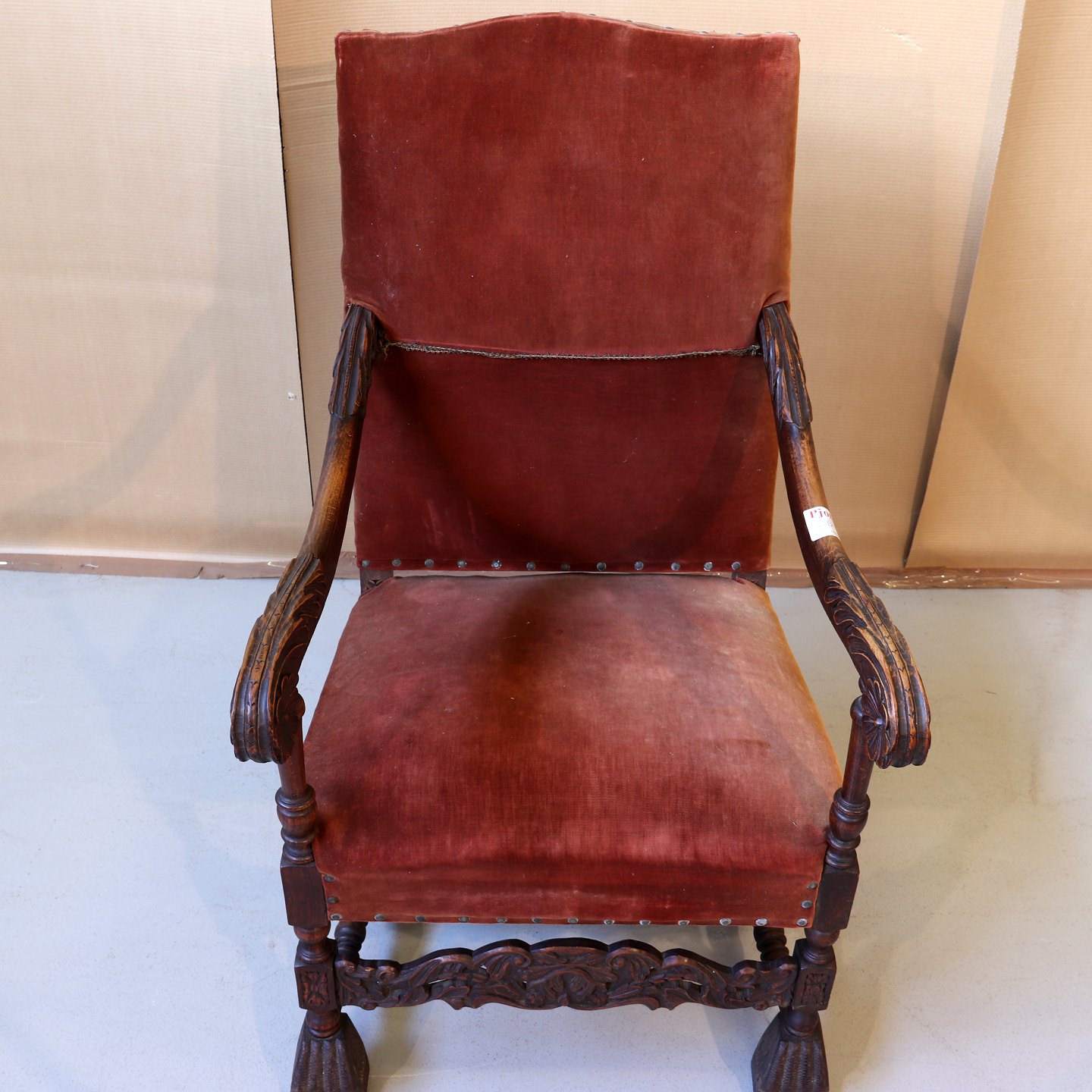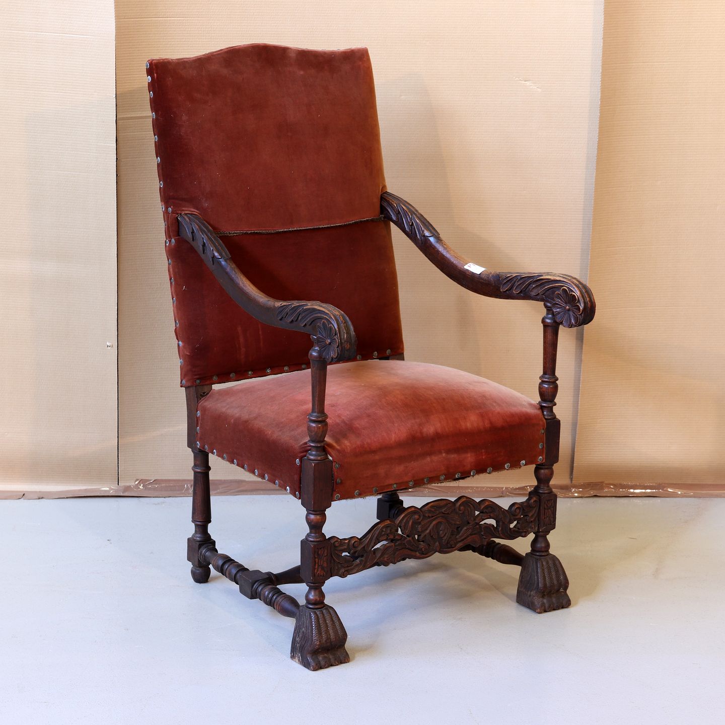 Armstol i bejdset egetræ m. løvefødder, 114 cm høj, sædehøjde 44 cm, ca. 1930