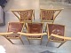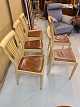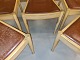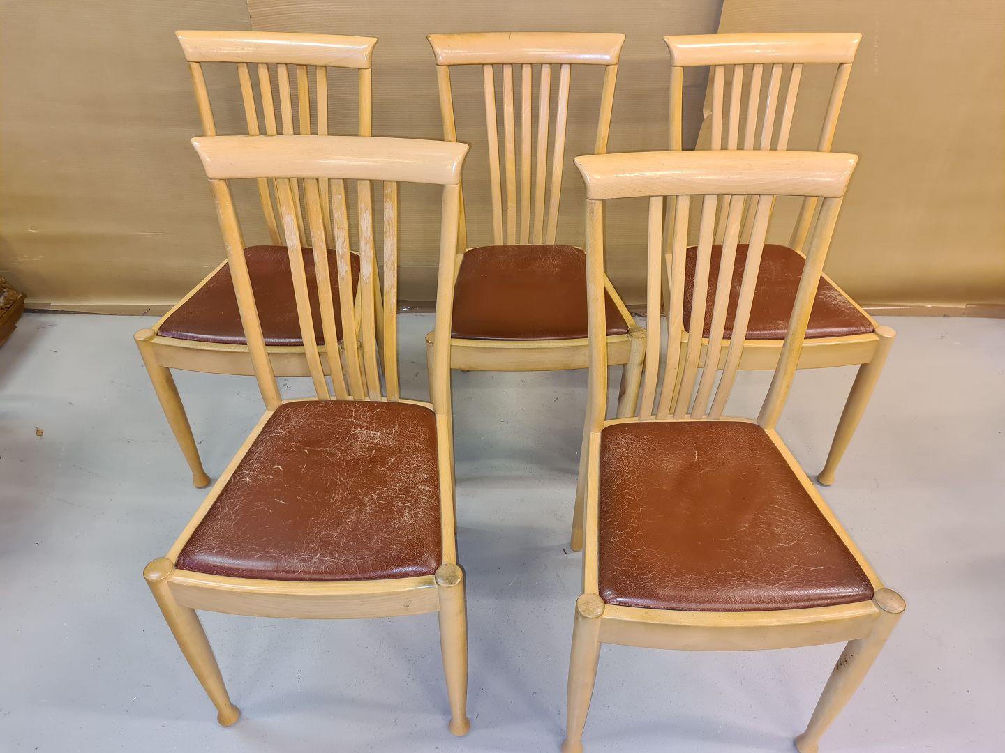 5 nyere spisebords stole i bøgetræ med lædersæde. Fremstår med lettere brugsspor på sæder. HxBxD 90x46x57 cm. Siddehøjde 46 cm. Emne nummer: 60376