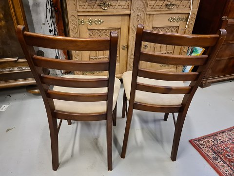 2 nyere fremstillede Spisebordsstole i bejdset bøg med stofsæder. Fremstår gode og stabile uden nævneværdige brugsspor. HxBxD 92x46x55 cm. Siddehøjde 48cm. Emne nummer: 60404