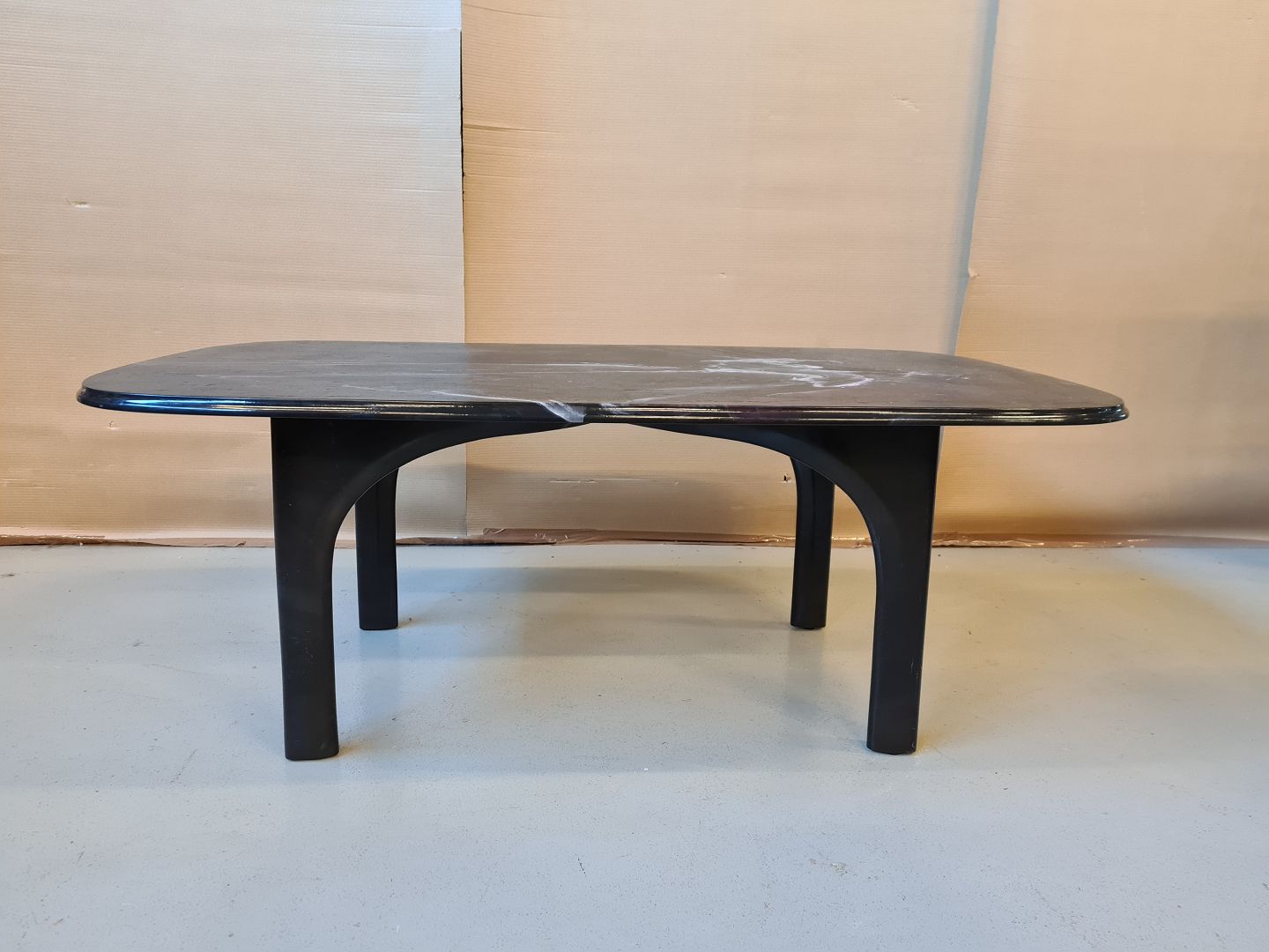 Sofabord med plade af støbt stenmasse og stel af støbt plast.