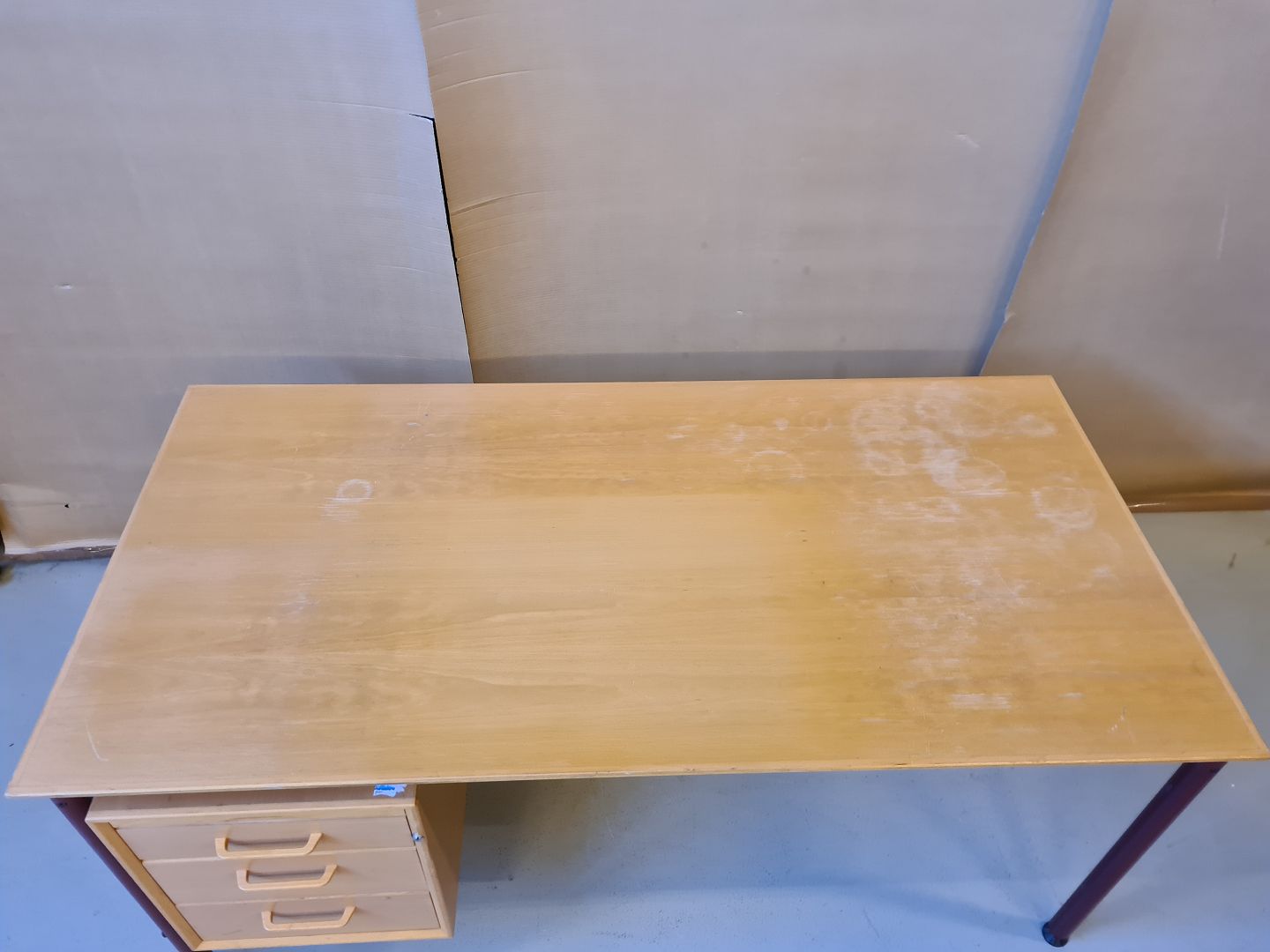 Skrivebord med metal stel og plade i fineret bøgetræ. Pladen har brugsspor. H 70 B 160 D 80 Emne nummer: 70400