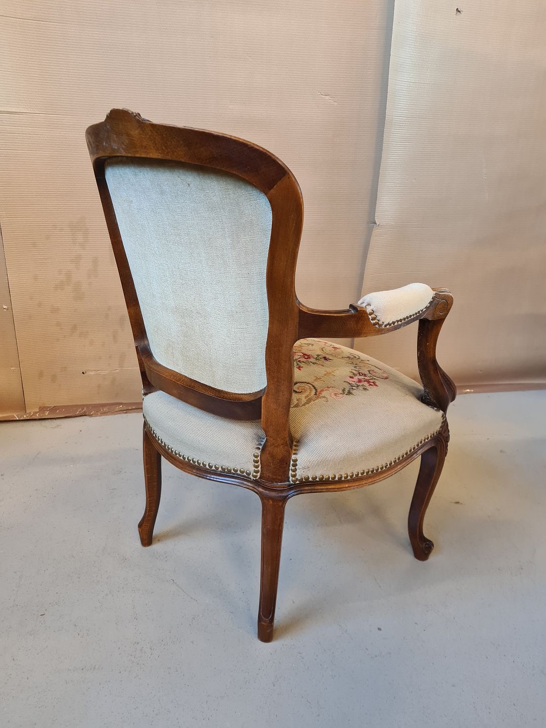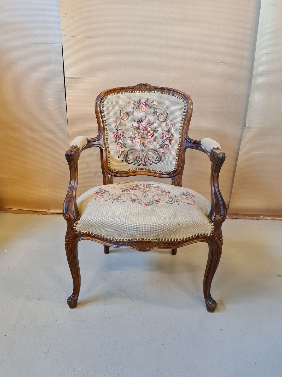 Stol i rokokostil af bøgetræ fra 1930erne. Betrækket har brugsspor. Højde 89cm Sædehøjde 42cm Emne nummer: 70674