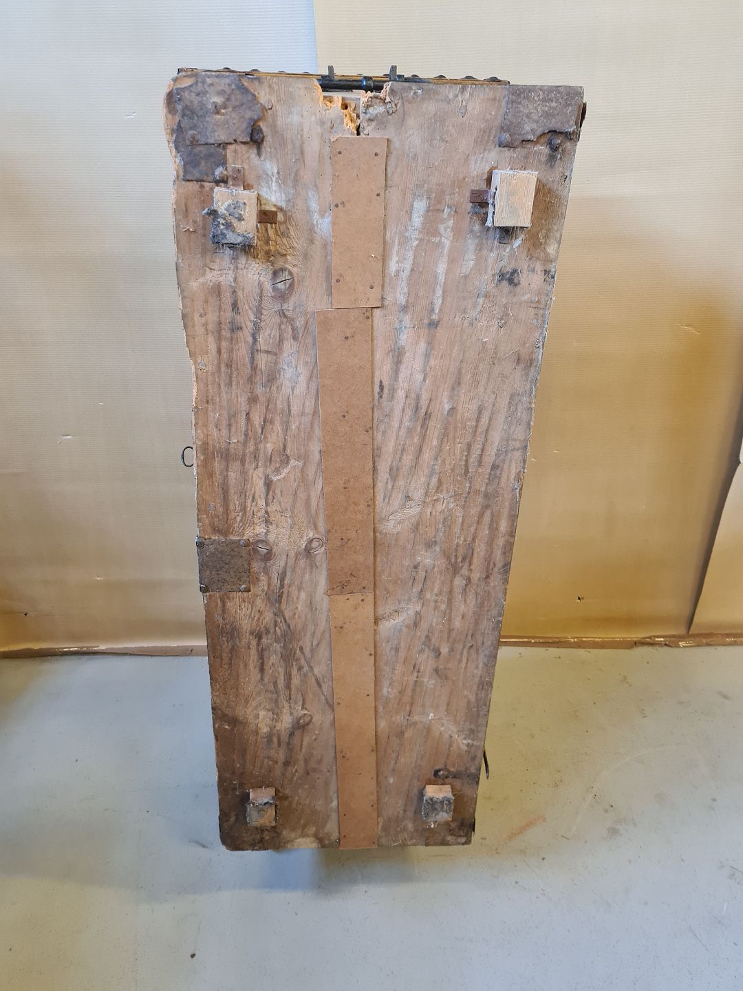 Kiste i massivt egetræ fra 1860erne. Kisten har brugsspor og er defekt i bunden. H 73cm B 143cm D 61cm Emne nummer: 70922