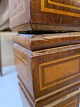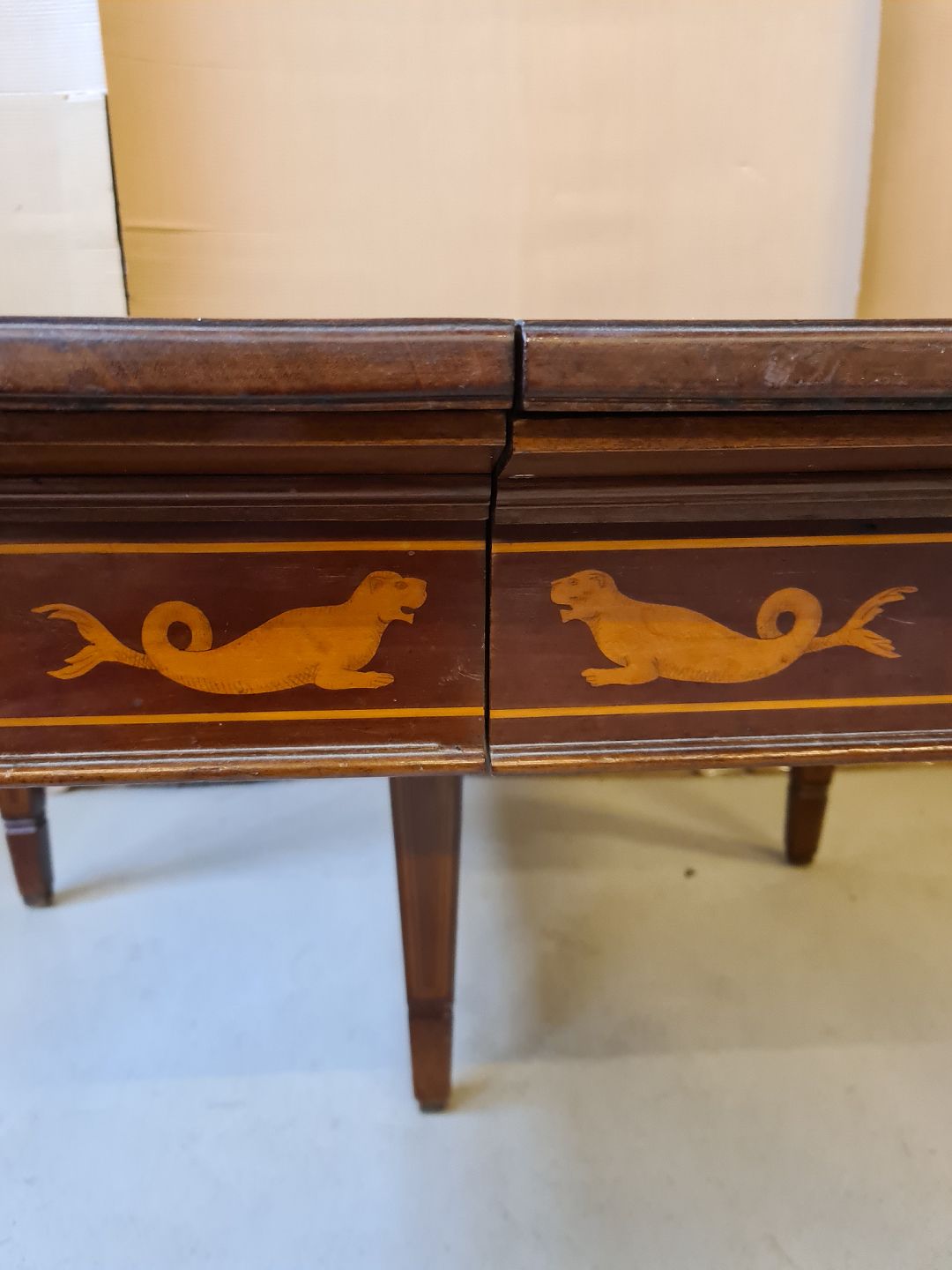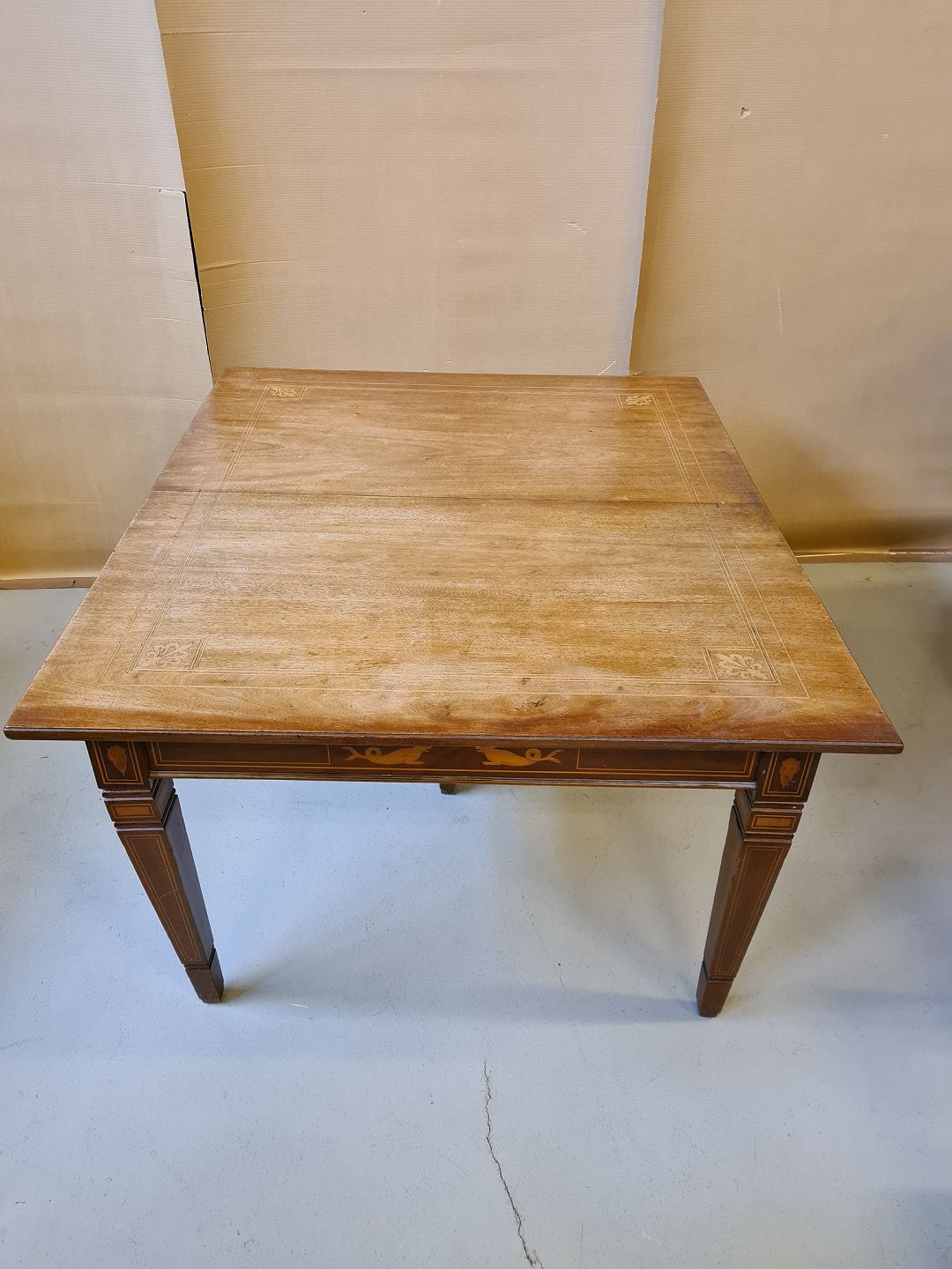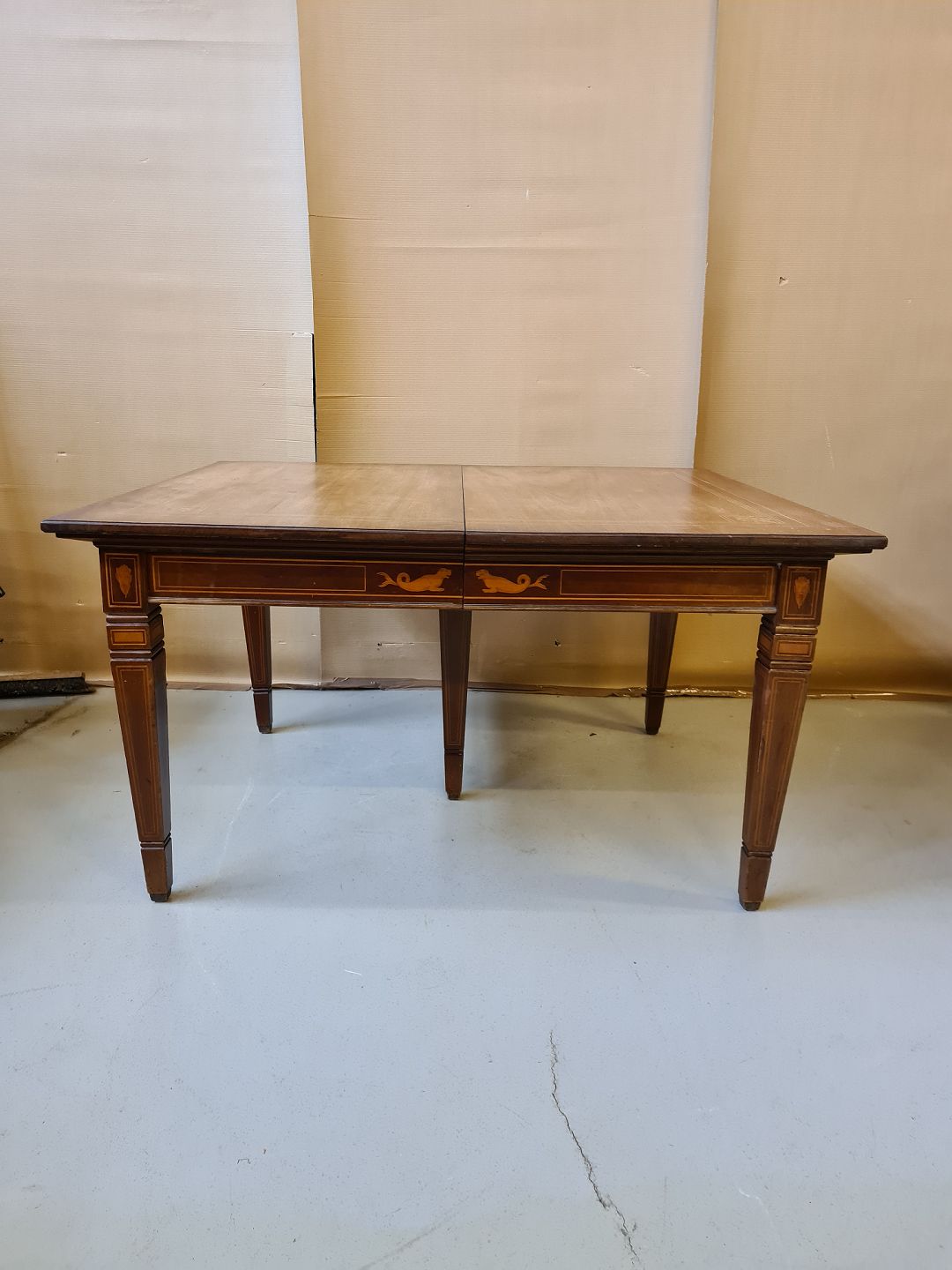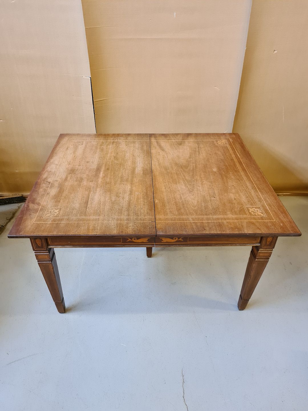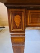 Spisebord i empirestil med intarsia af massivt mahogni fra 1910erne. Benene skal limes og det har brugsspor. H 75cm B 116cm L 137cm tillægspladerne måler : En på 100cm og en på 68cm Emne nummer: 71151