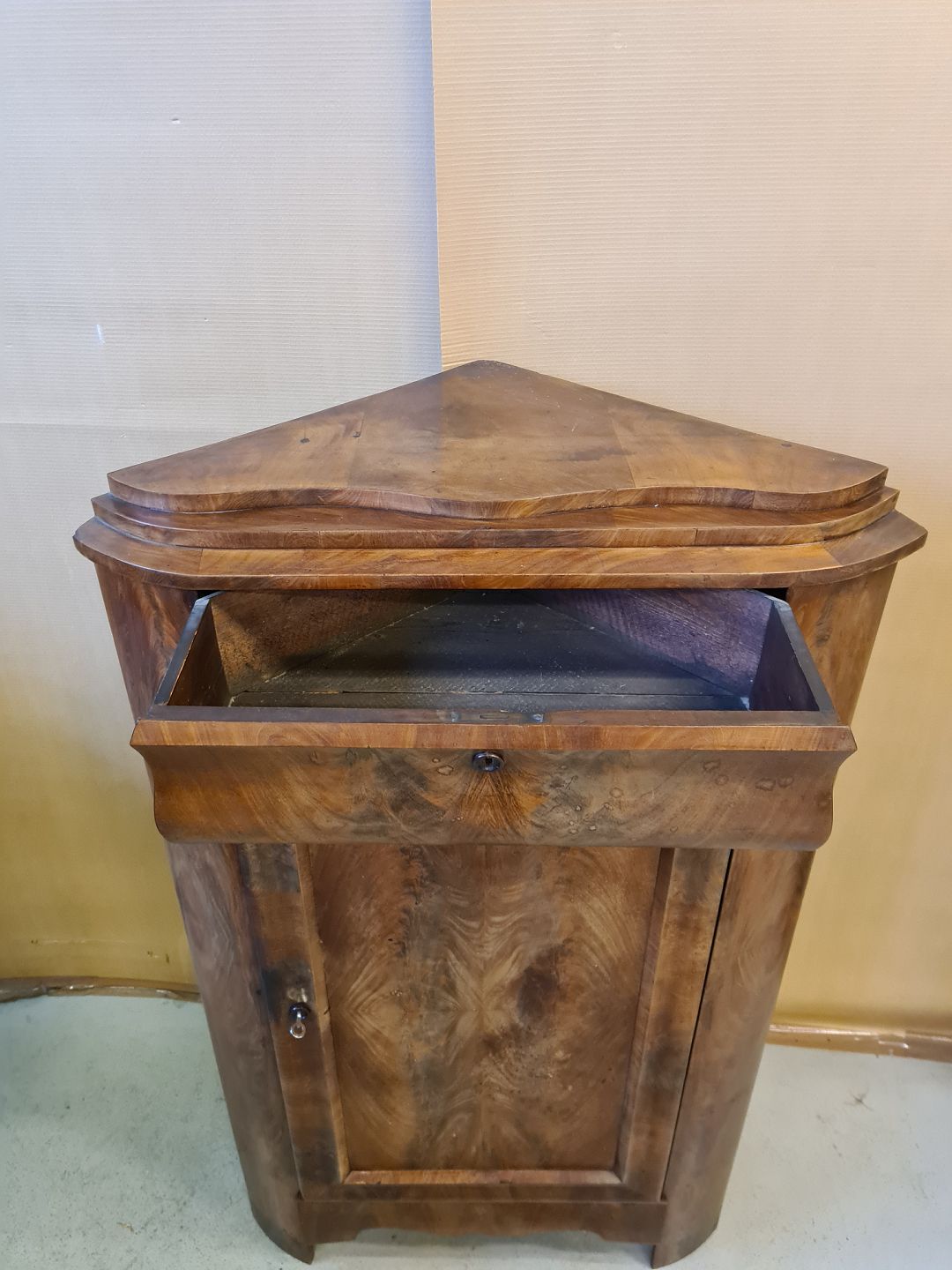 Hjørneskab i fineret mahogni fra 1890erne.