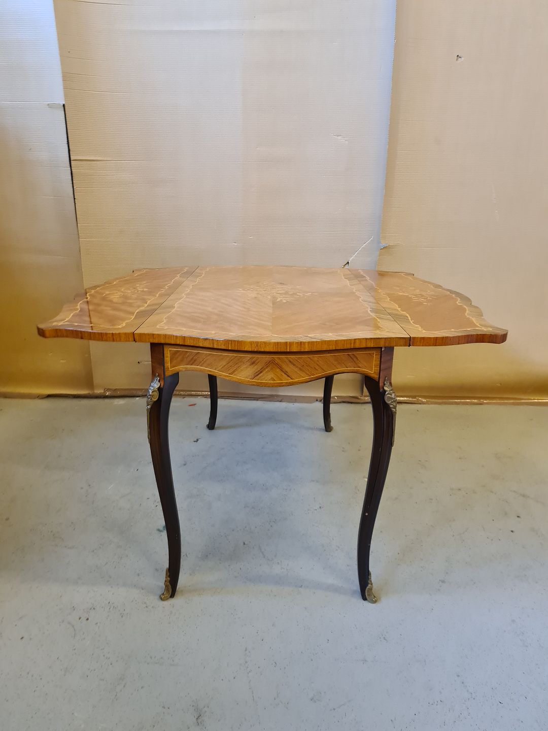 Sofabord i fineret og lakeret mahogni med intarsia af rosentræ fra 1980erne. Bordpladen har finer defekter.. H 59cm L 100cm B 50cm Brede med klapper 99cm Emne nummer: 71627