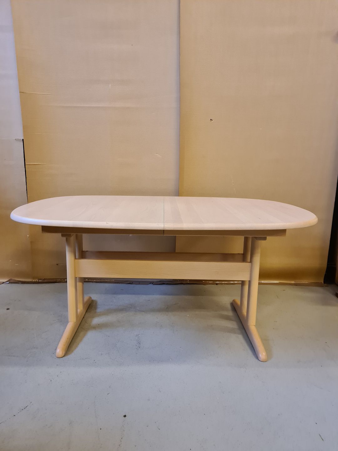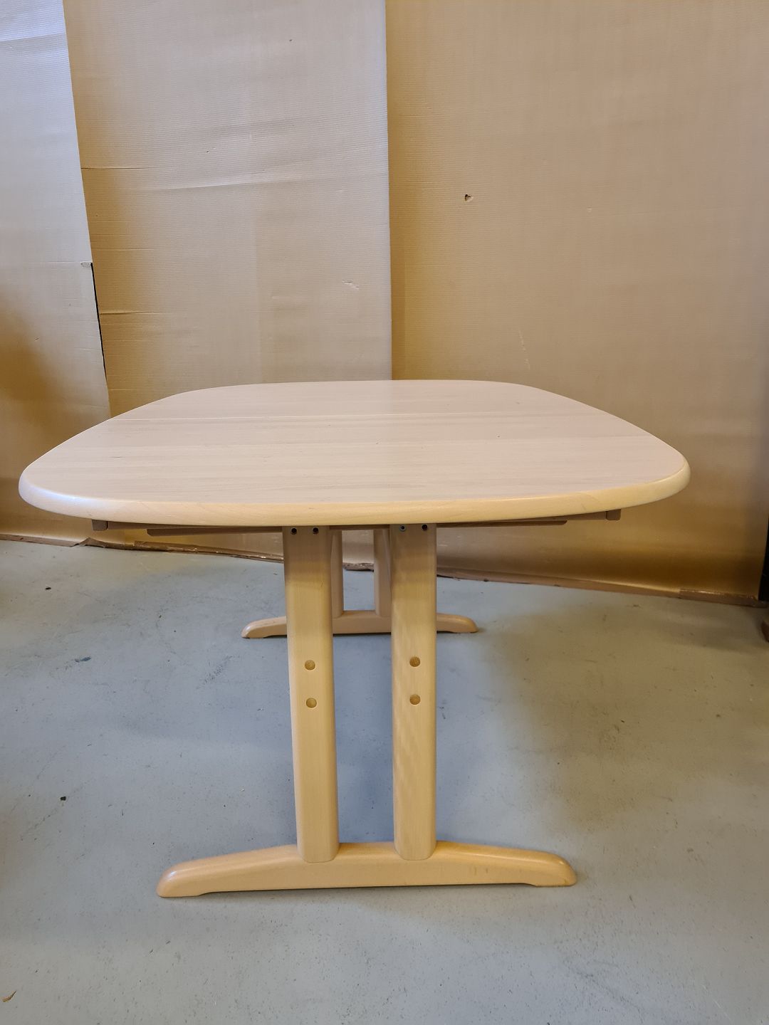 Spisebord i massivt bøgetræ med 2 tillægsplader fra 1990erne. Bordet har brugsspor. H 73cm B 105cm L 158cm Længde med 2 tillægsplader 251cm Emne nummer: 71788