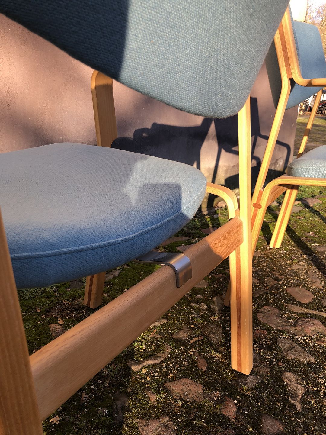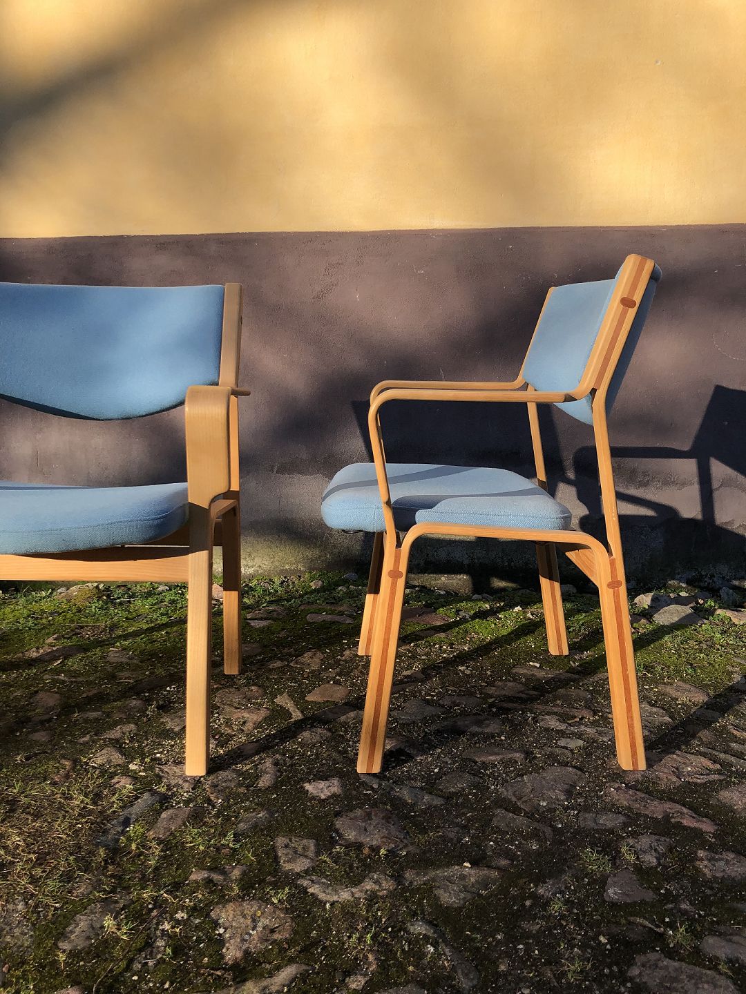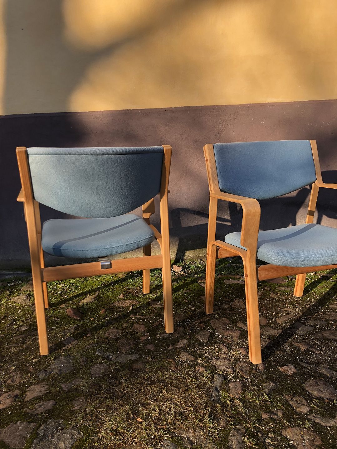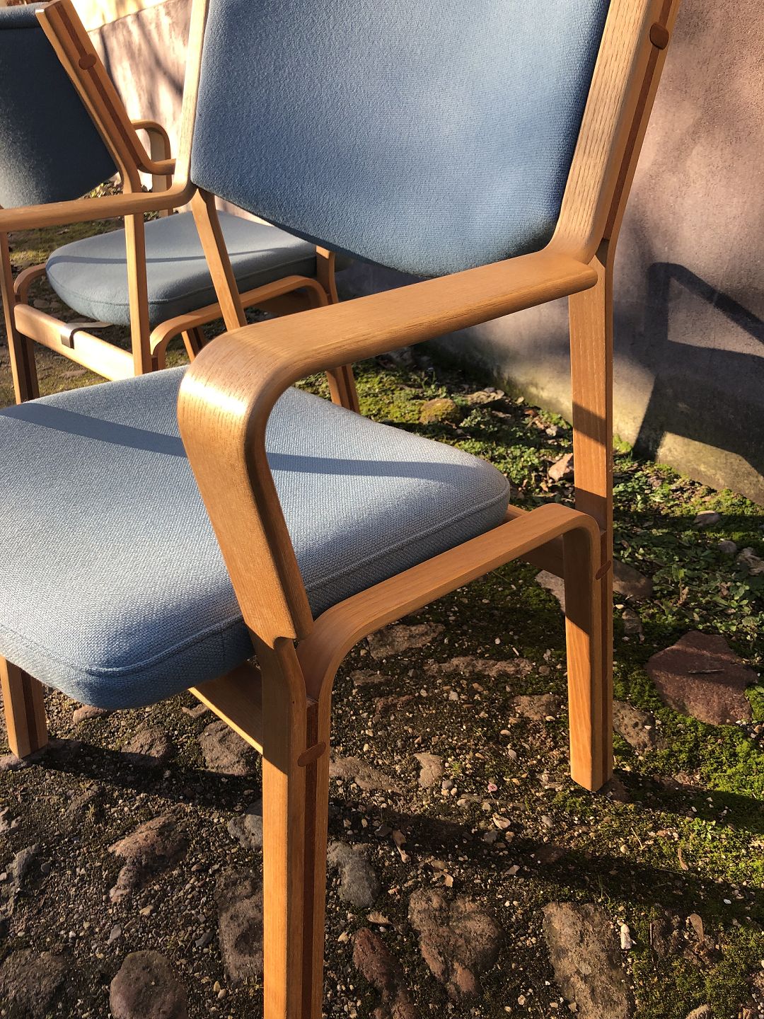 Et par sjældne armstole af Hans J. Wegner model JH742 udført i Ask indlagt med Teak og betrukket med Hallingdal uld.