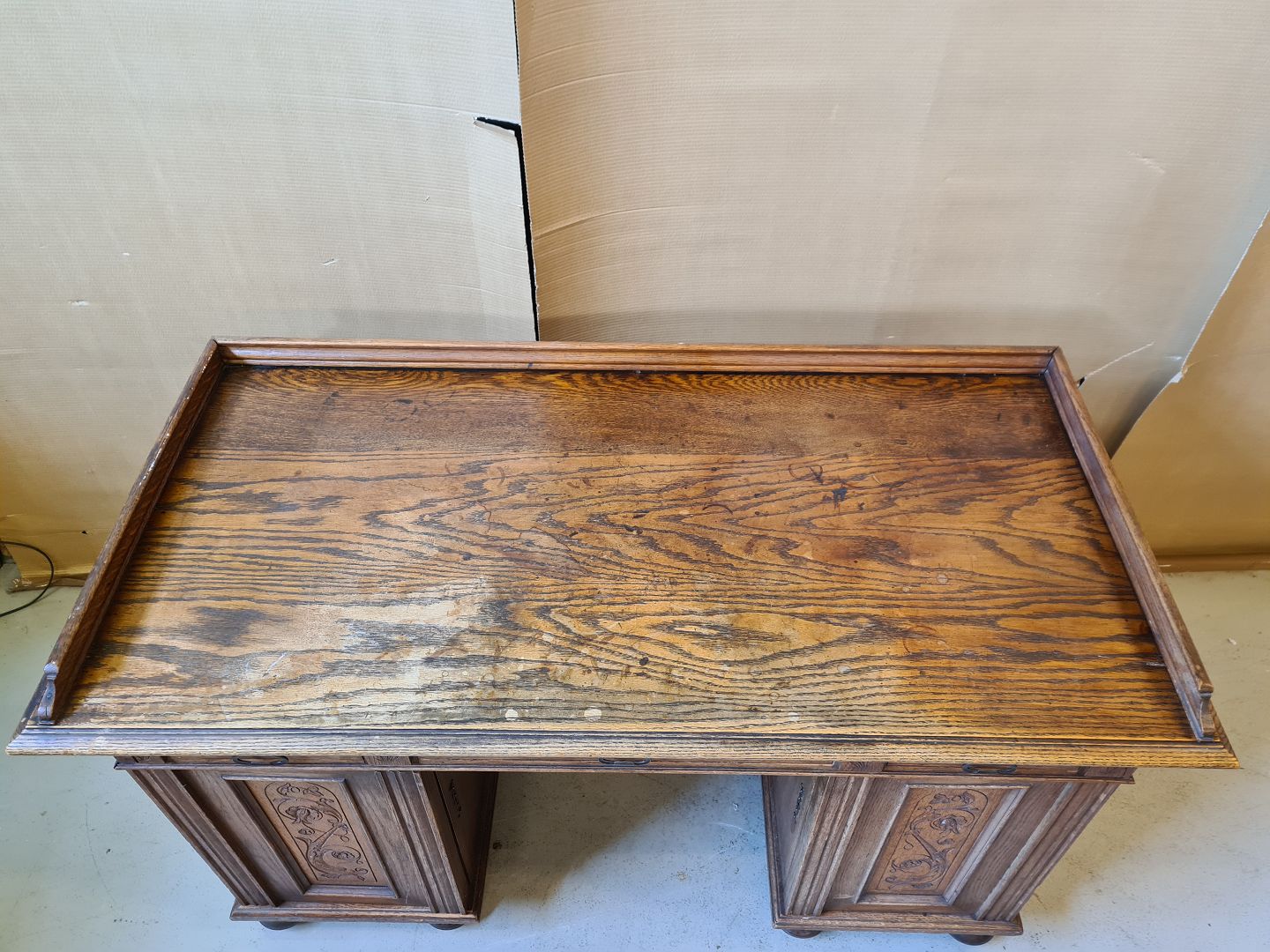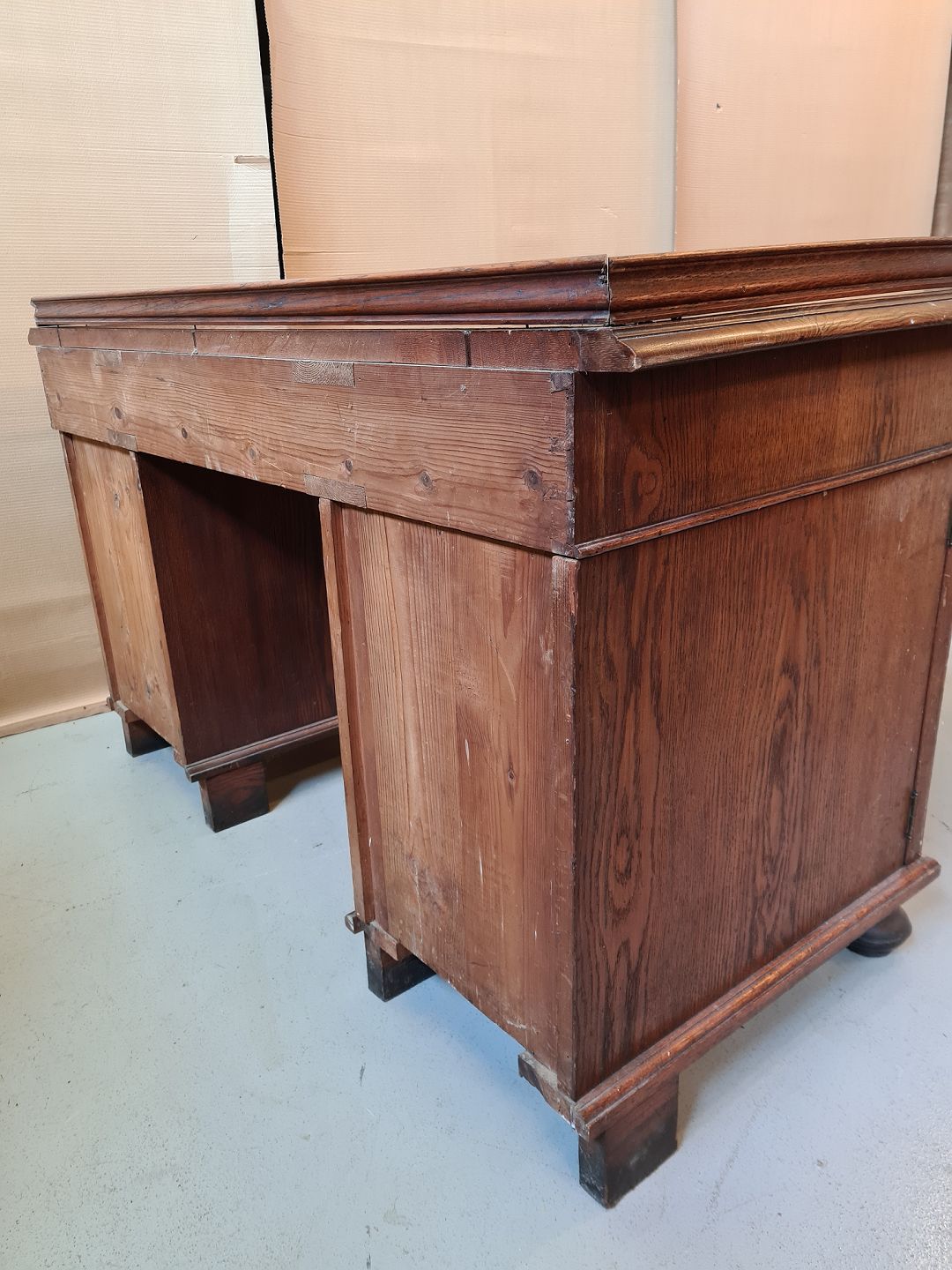 Skrivebord i fineret og massivt egetræ fra 1910erne. Det har brugsspor. H 84cm B 137cm D 66cm Højde fra gulv til skuffen er 65cm Emne nummer: 71998