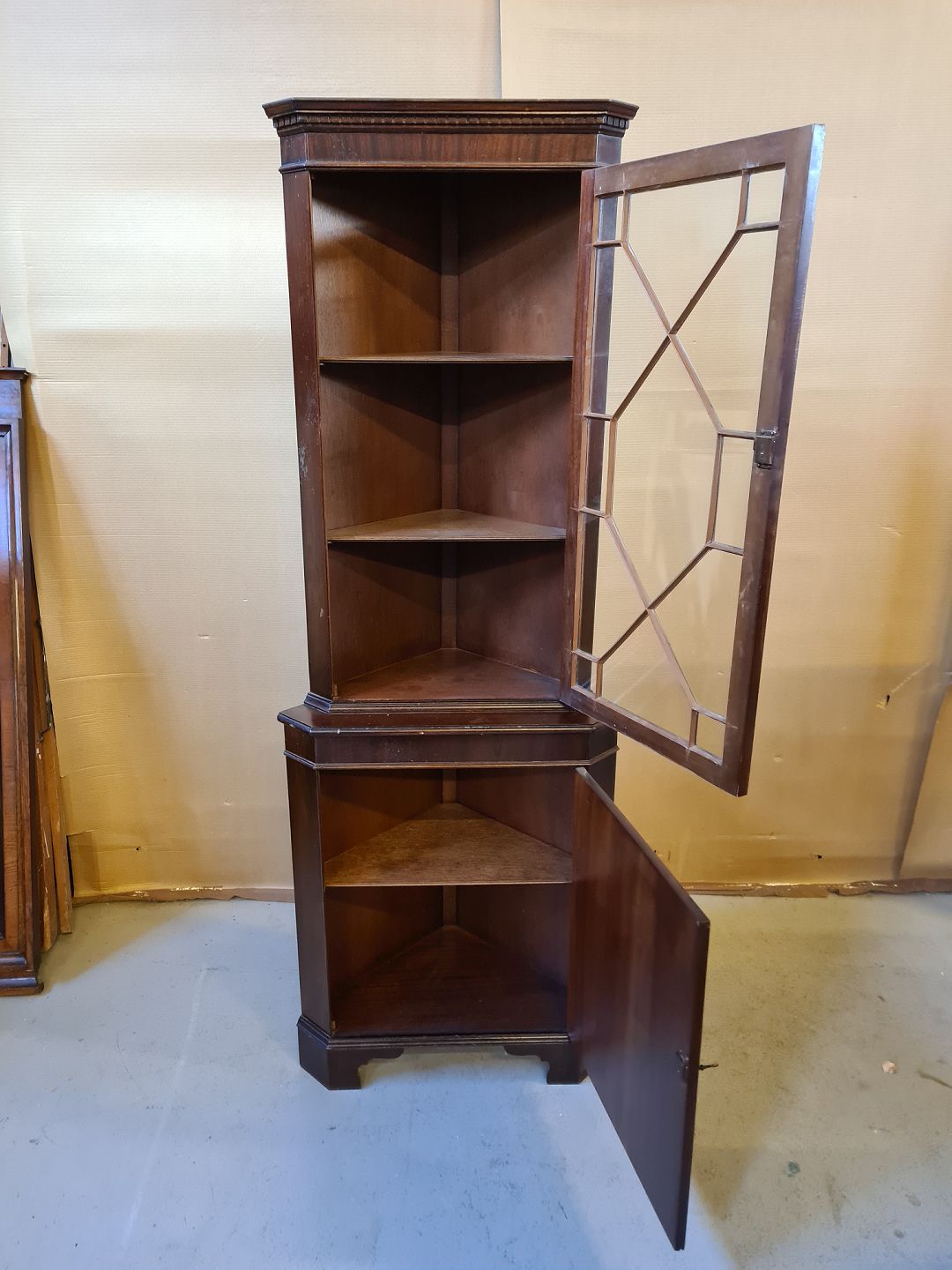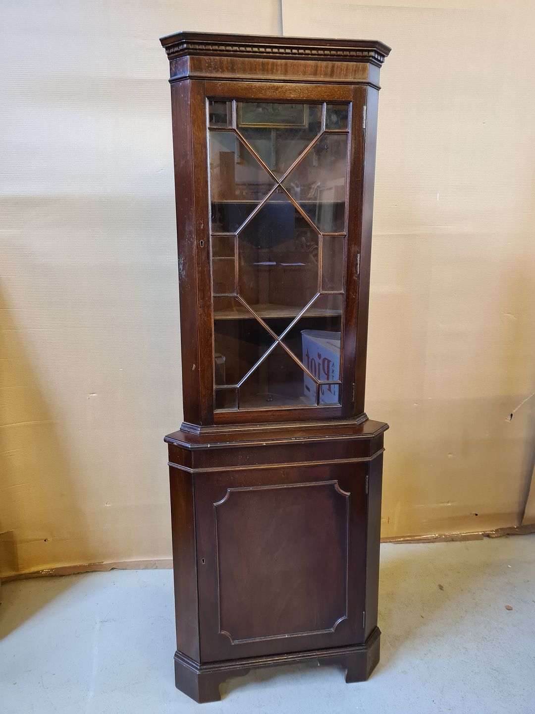 Hjørneskab i fineret mahogni fra 1980erne. Det har brugsspor. H 180cm De to dybder er 47cm ( brede 65cm) Emne nummer: 72052