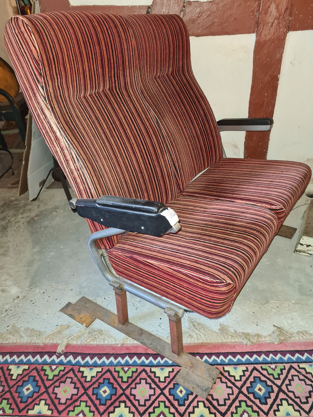 Dobbelt passagersæde. Fremstillet til en bus i 1960´erne. Fremstår udmærket stabile med en lettere falmen på sæderne. Ryggen kan skubbes tilbage på sædet til venstre. HxBxD 98x97x80 cm. Siddehøjde 40 cm. Emne nummer: 80183