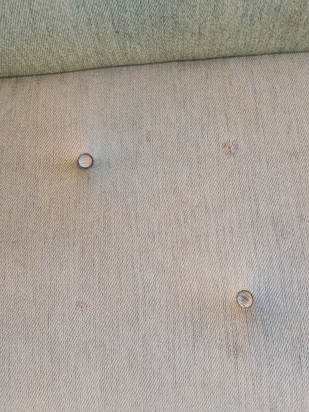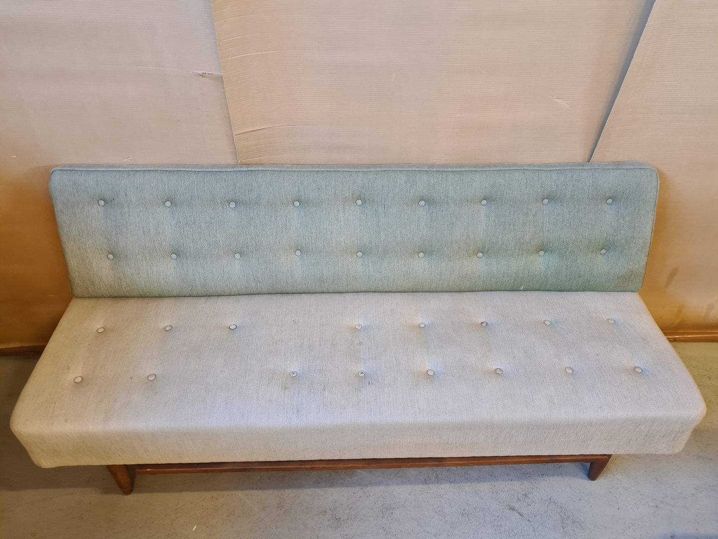 Briks med løs ryg og skuffe fra 1950erne. Den har brugsspor og mangler et par knapper. Sødehøjde 41cm ryghøjde 82cm Bredde 69cm Længde 190cm Emne nummer: 72353