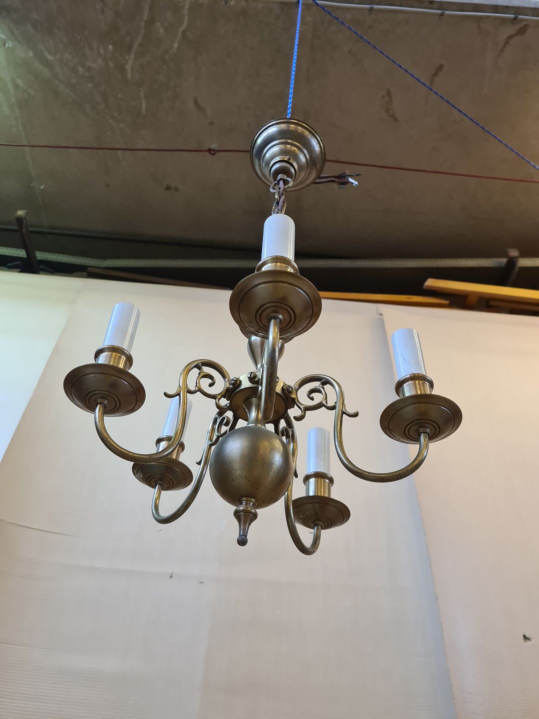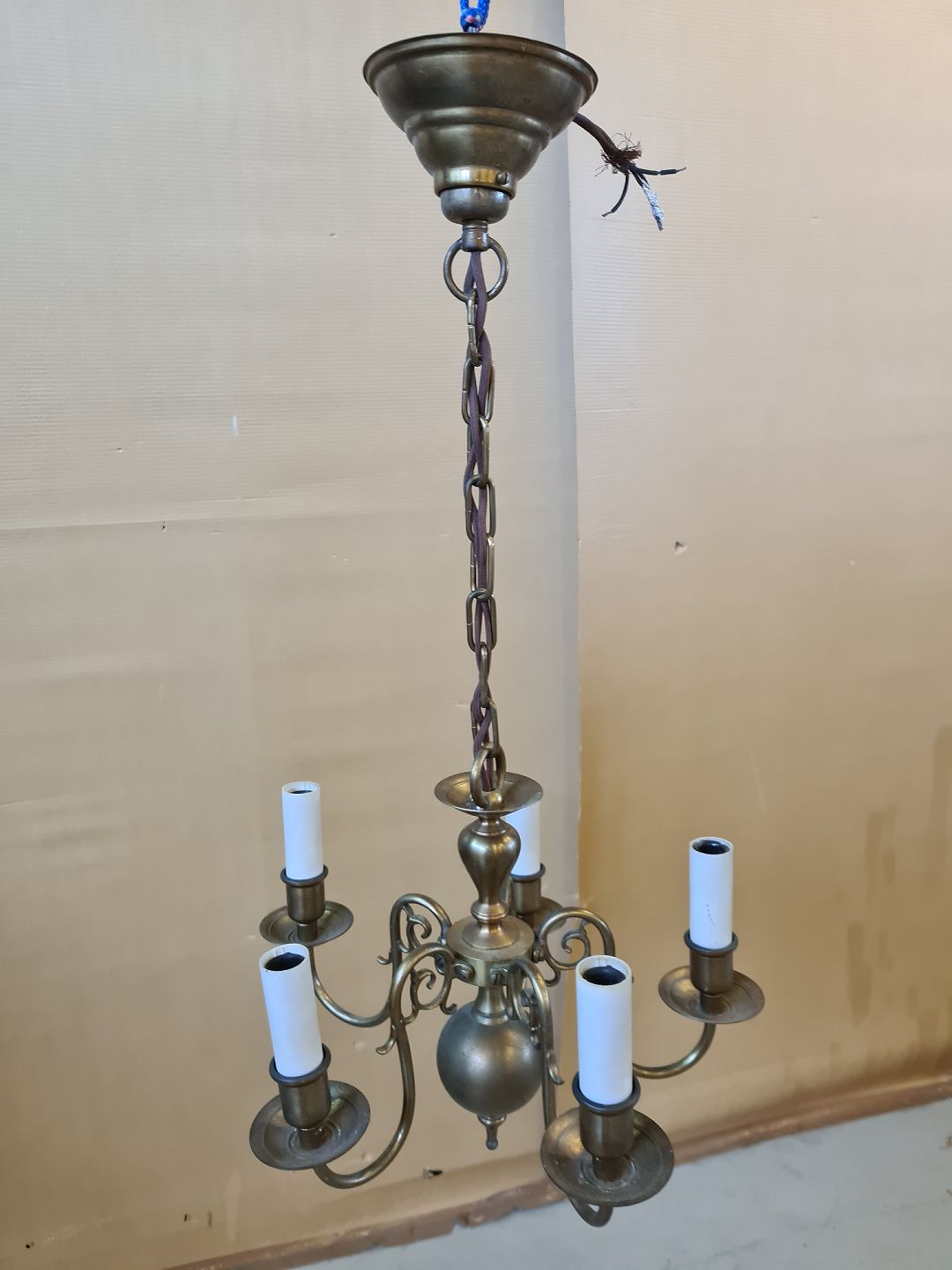Kirkekrone i messing med 5 arme, fra 1930erne.