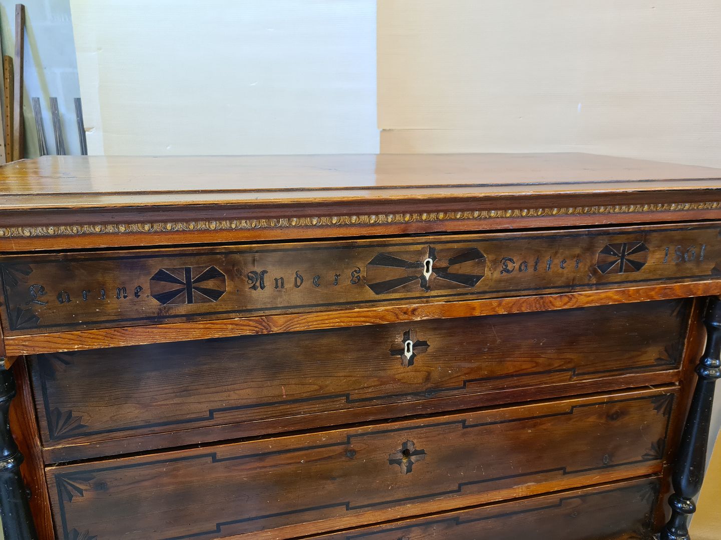 Dragkiste i massivt fyrretræ, fra det Herrens år 1861 Den har brugsspor/patina. H 138cm B 130cm D 56cm Emne nummer: 72491