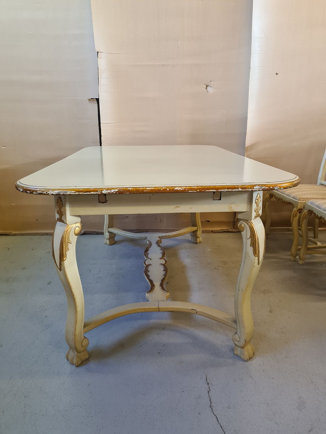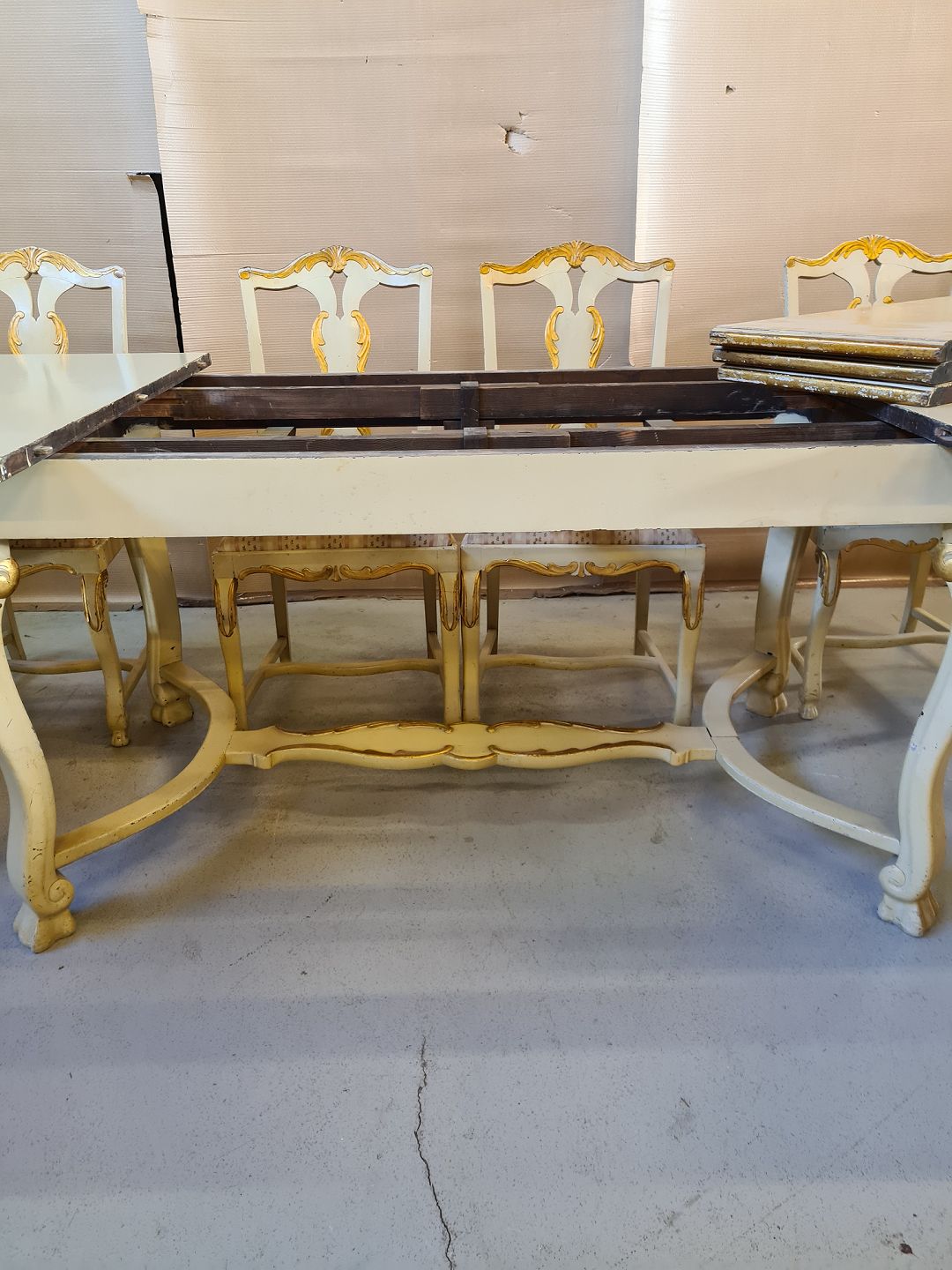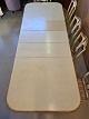 Spisebord med 3 tillægsplader og 6 stole, fra 1920erne. Sættet har brugsspor, stolene er stabile men betrækket er godt brugt. Bord : H 75cm B 100cm L 161cm Længde med 3 tillægsplader 260cm Stolene : Højde 95cm Sædehøjde 45cm Emne nummer: 72591