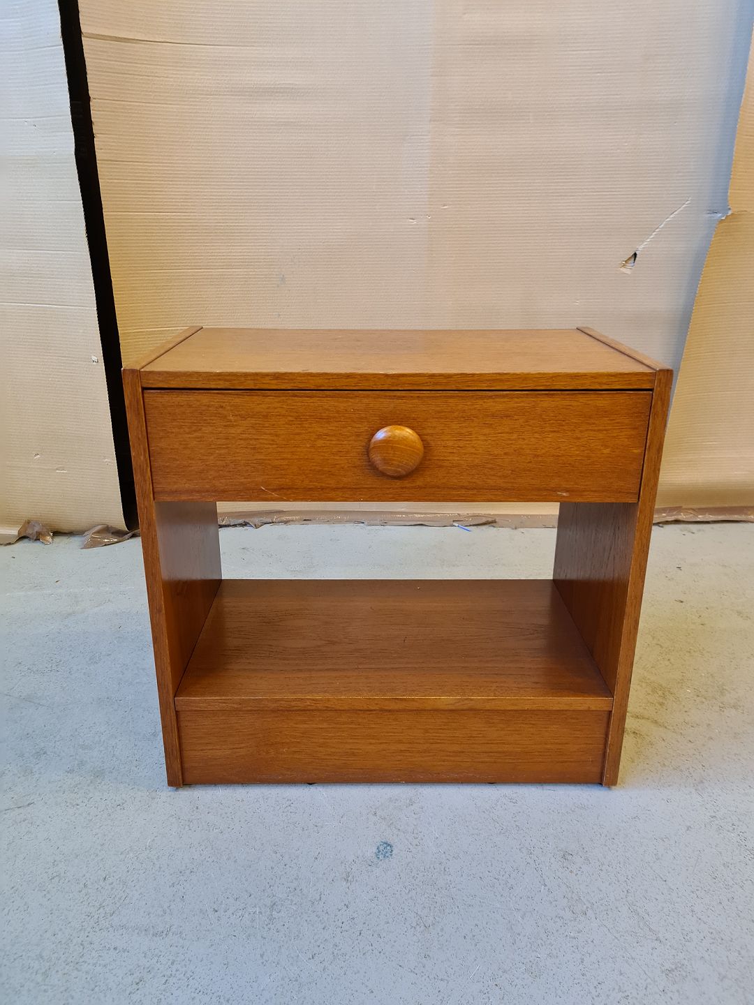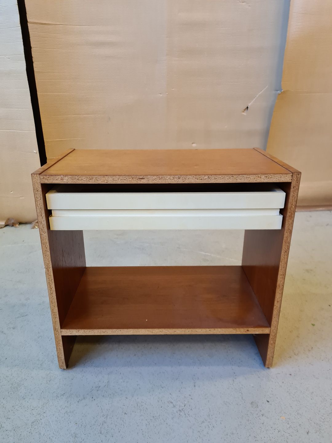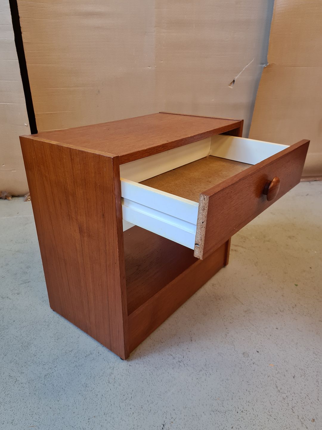Natbord med skuffe i fineret teaktræ, fra 1970erne.