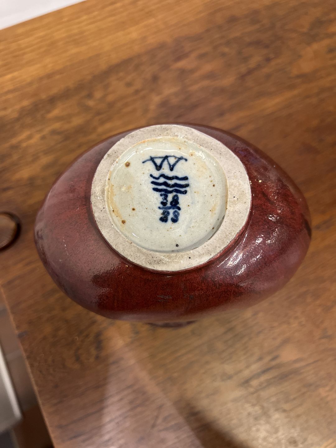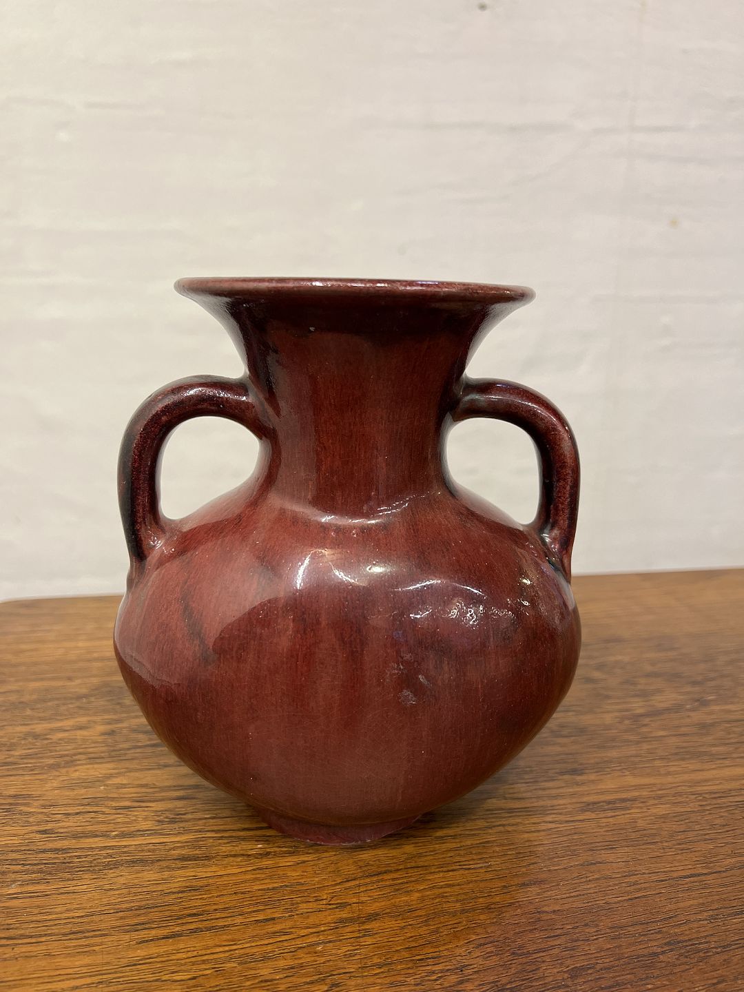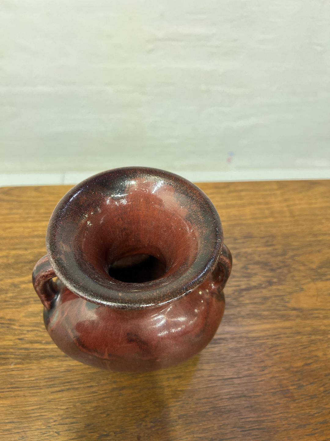 Bode Willumsen vase i stentøj glaseret med okseblods glasur. Udført hos Den Kgl. Porcelænsfabrik ca. 1930'erne. Pæn stand. Sign. med monogam. Mål: H. 18 cm. B. 17 cm. D. 9 cm. Emne nummer: 50623