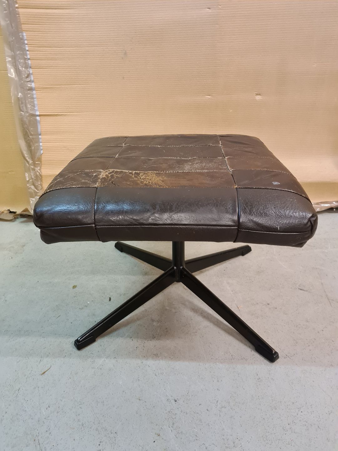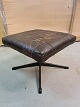 Fodskammel i metal og læder, fra 1980erne. Den har brugsspor og slid, og er gået op i en syning.( se foto ) H 34cm B 46cm D 46cm Emne nummer: 73202