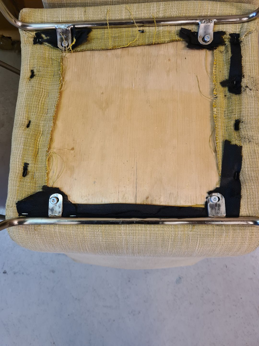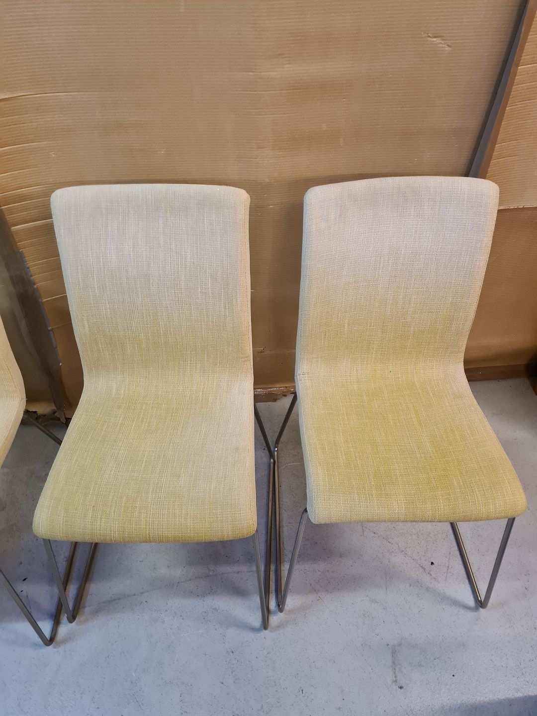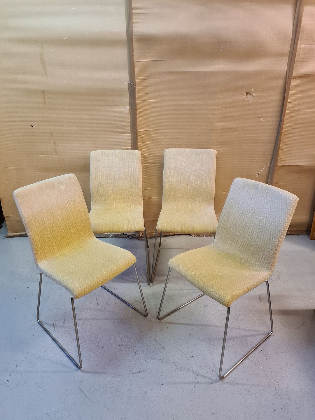 4 Stole med ben af stål, fra 1990erne. Betrækket er godt brugt og har brugsspor. Højde 85cm Slædehøjde 47cm Emne nummer: 73304