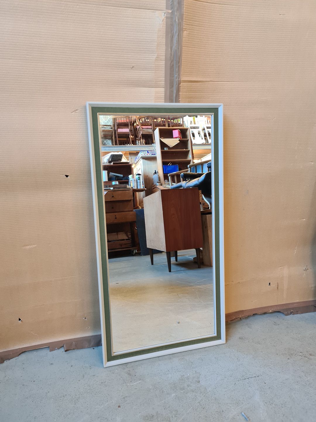 Spejl i malet ramme med grønt hessian, fra 1970erne.