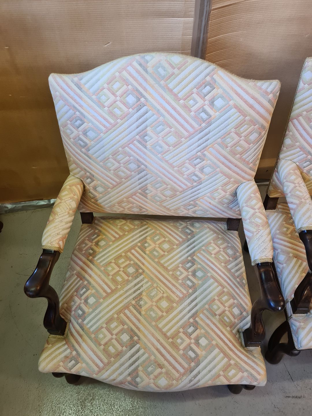 2 Armstole i bejdset birketræ, fra 1950erne. De har slid på armlæn og der medfølger 2 små puder. Højde 97cm Sædehøjde 40cm Emne nummer: 73499