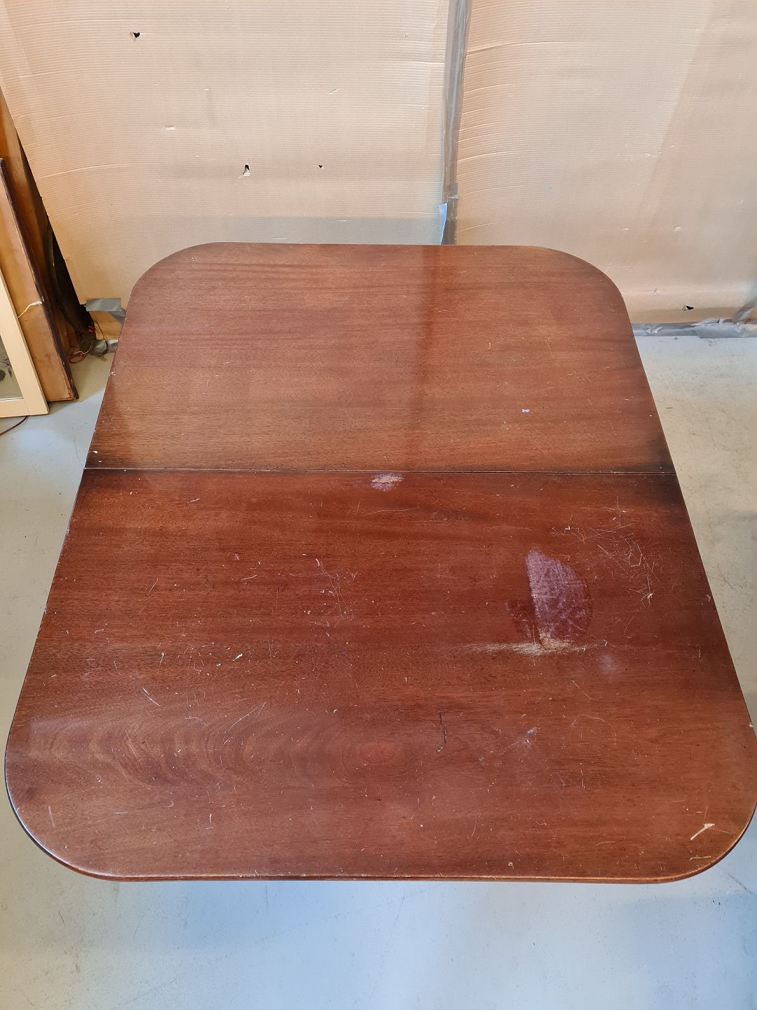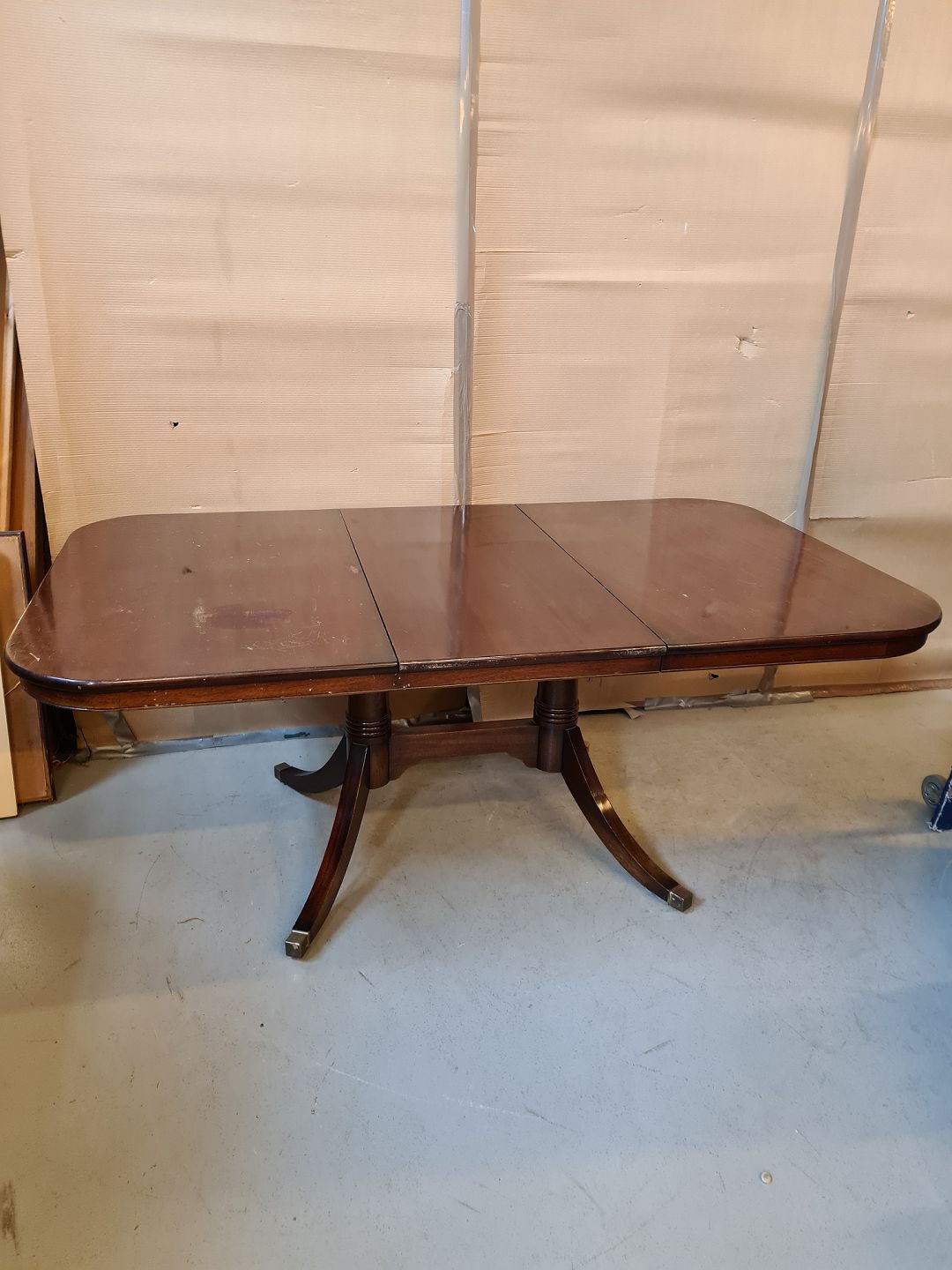 Spisebord i finere mahogni, fra 1980erne. Bprdpladen har mange brugsspor. Højde 76cm Bredde 109cm Længde 136cm Længde med tillægspladen 186cm Emne nummer: 73722