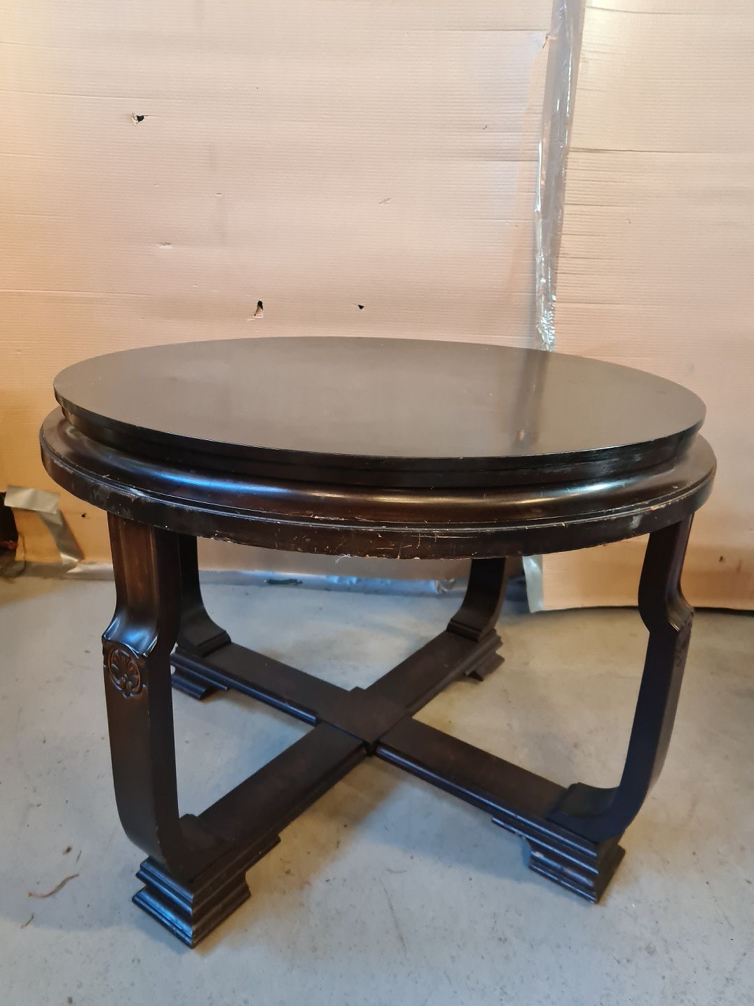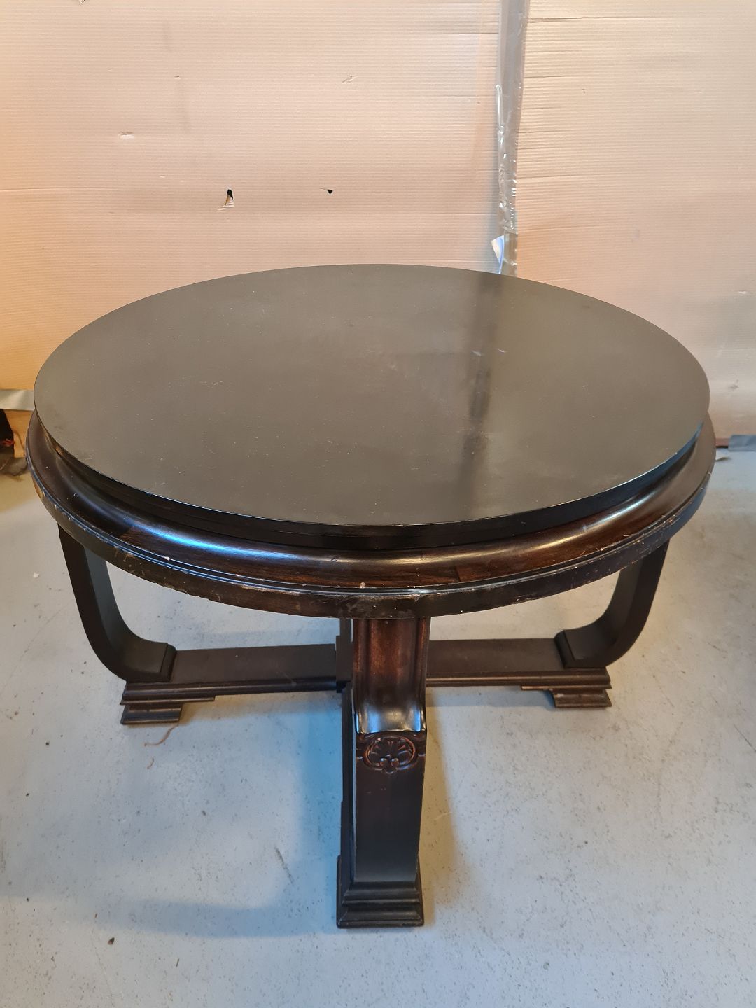 Rundt sofabord i fineret birketræ, fra 1930erne.