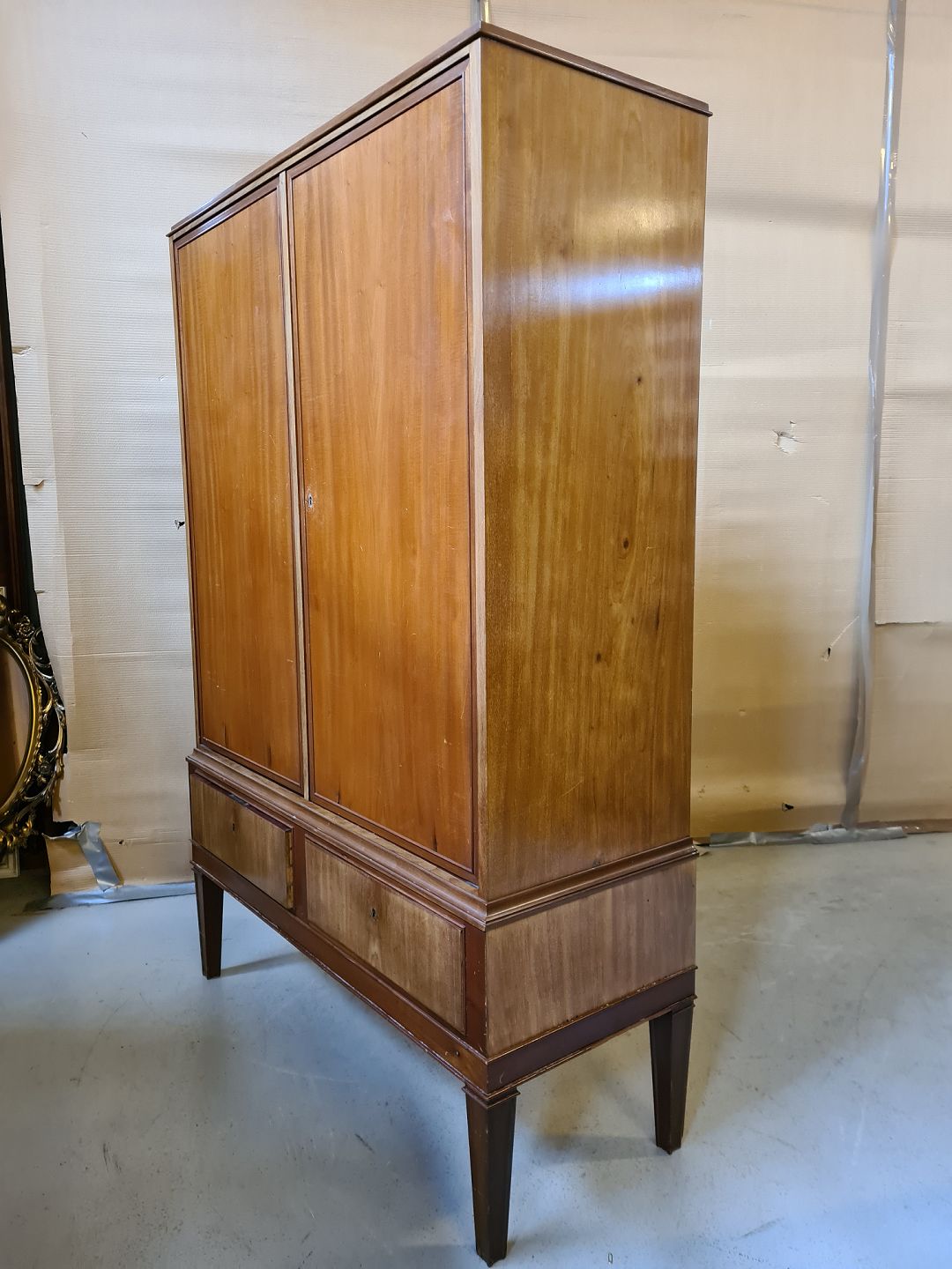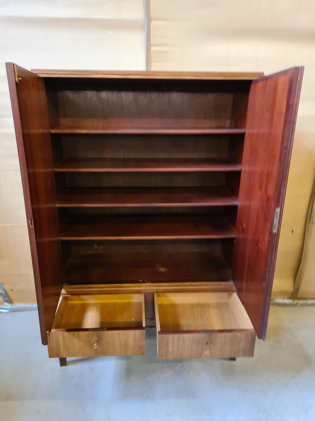 Lysberg Hansen og Terp dækketøjsskab i fineret mahogni, fra 1950erne. Det har brugsspor og defekte lister på soklen. Højde 154cm Bredde 103cm Dybde 40cm Emne nummer: 73809