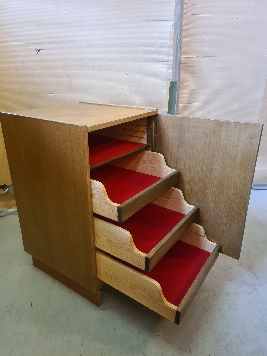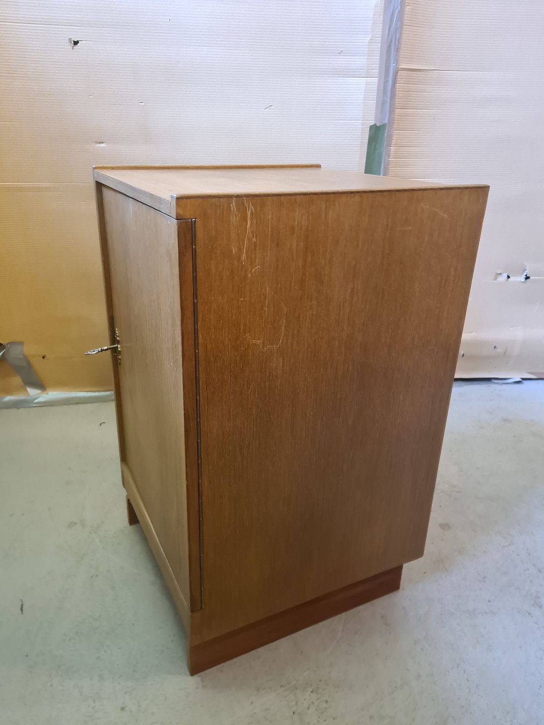 Skab i fineret egetræ, fra 1980erne. Det har brugsspor. Højde 73cm Bredde 44cm Dybde 44cm Emne nummer: 74079