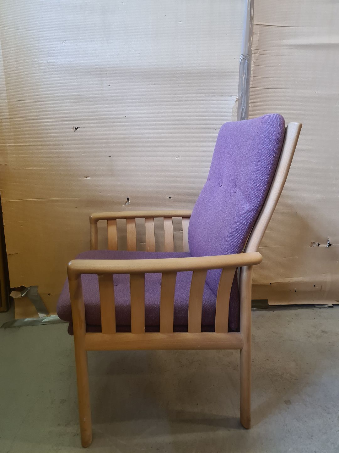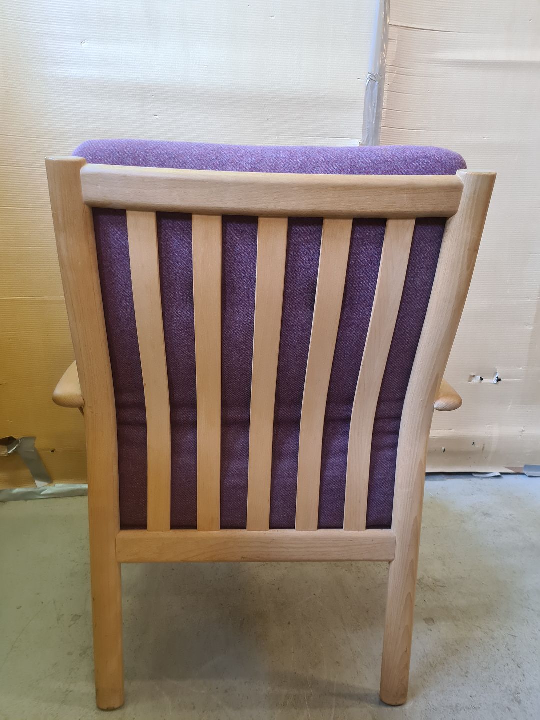 Lænestol i massivt bøgetræ med uldhynder, fra 200erne. Den har brugsspor. Højde 95cm Sædehøjde 45cm Emne nummer: 74080