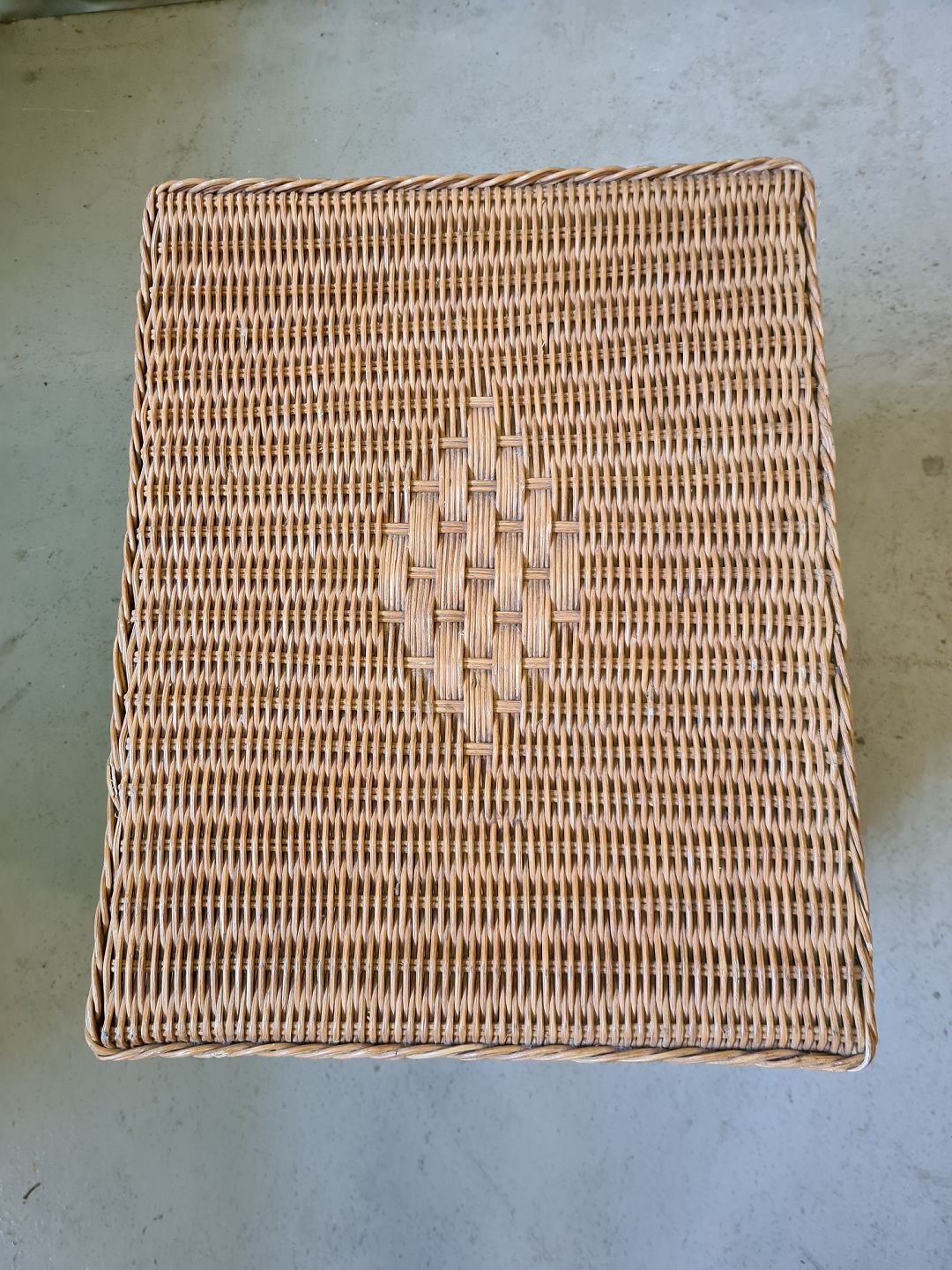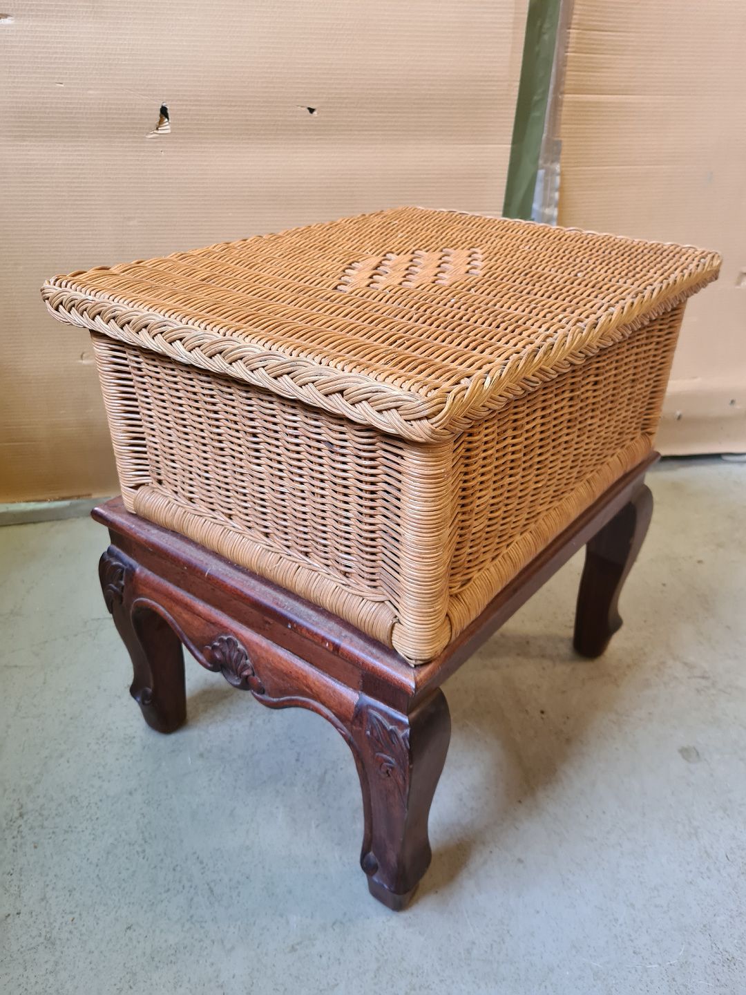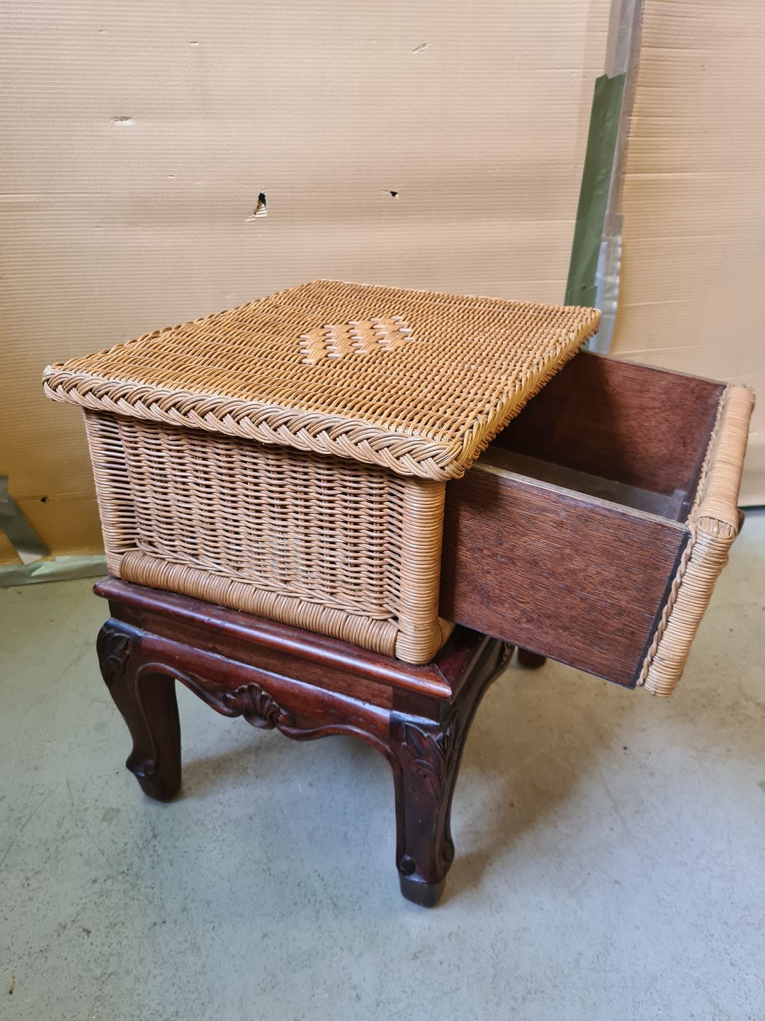 Natbord i massivt træ og kurveflet, fra 2000erne. Det har små brugsspor, men skuffen binder lidt. Højde 53cm Bredde 52cm Dybde 41cm Emne nummer: 74122