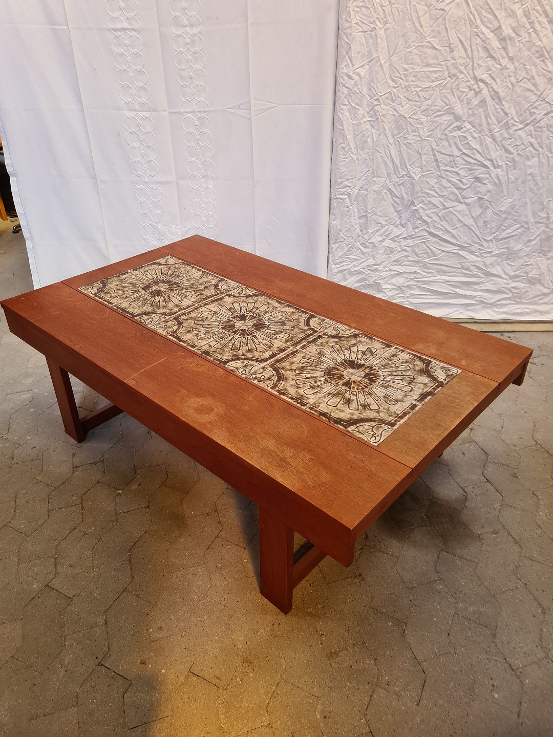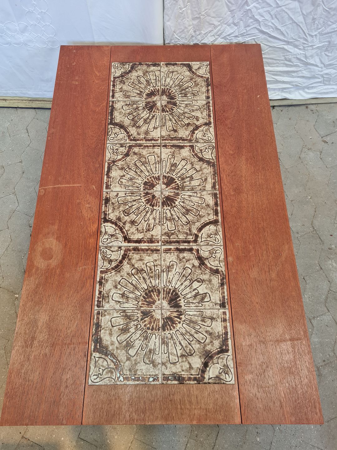 Sofabord i fineret og bejdset egetræ med kakler, fra 1970erne. Det har brugsspor. Højde 48cm Bredde 85cm Længde 140cm Emne nummer: 90534