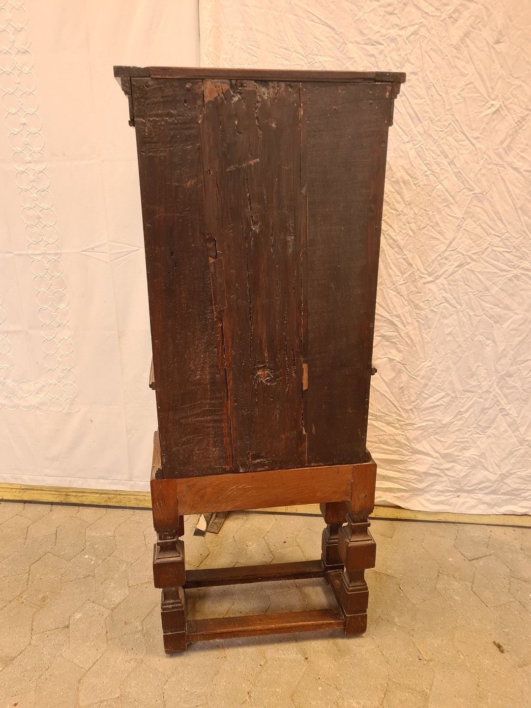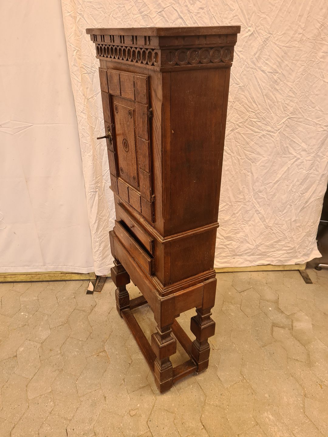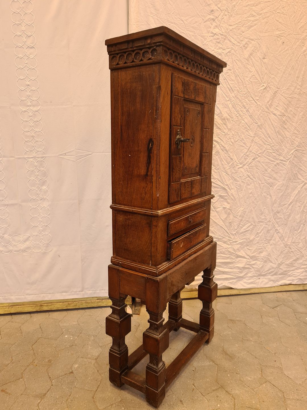 Skab i massivt egetræ, fra 1870erne. Det har brugsspor. Højde 135cm Bredde 53cm Dybde 24cm Emne nummer: 90568