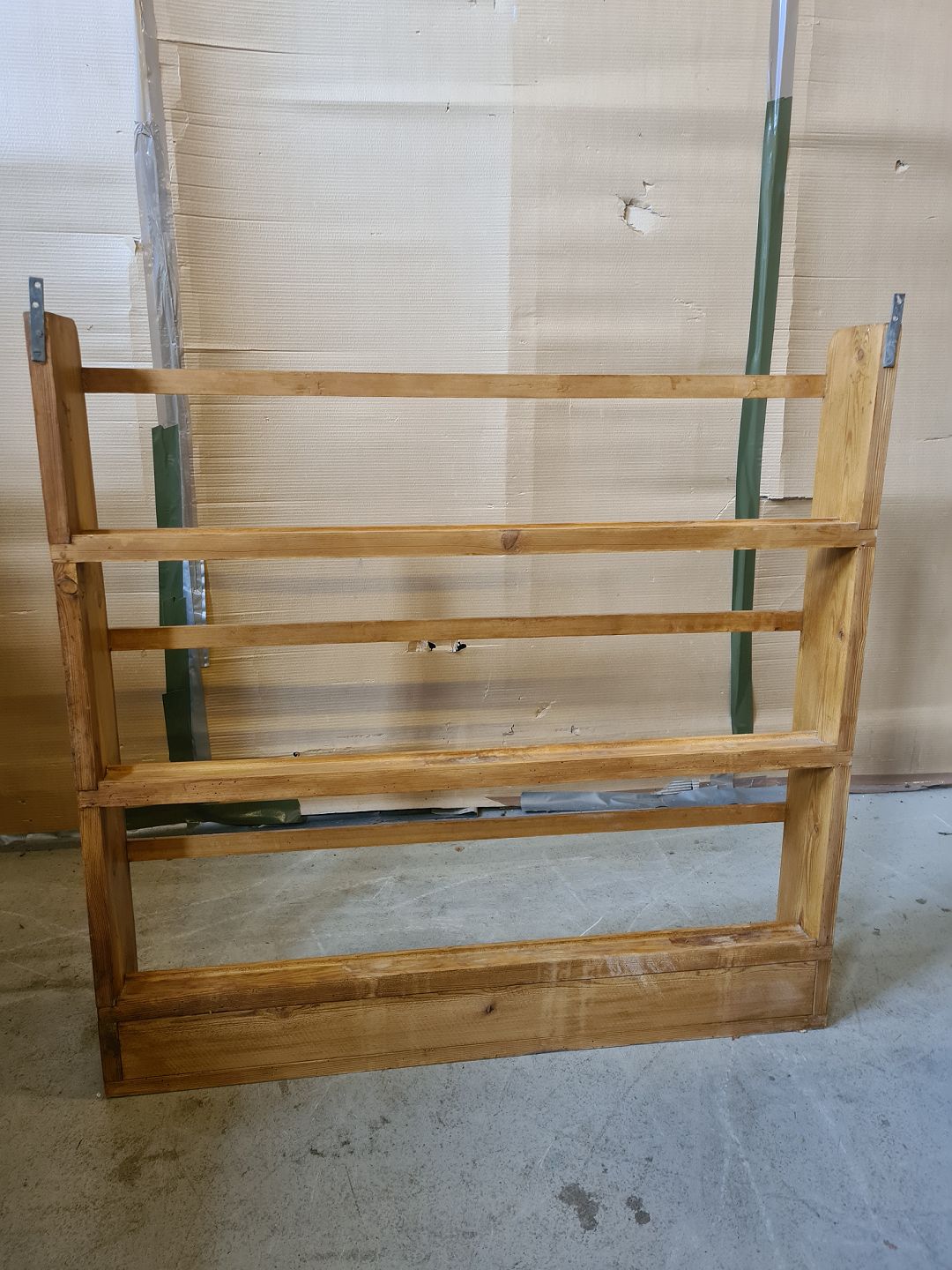 Tallerkenrække i massivt fyrretræ, fra 1930erne. Den har patina. Højde 107cm Bredde 105cm Dybde 20cm Emne nummer: 74253