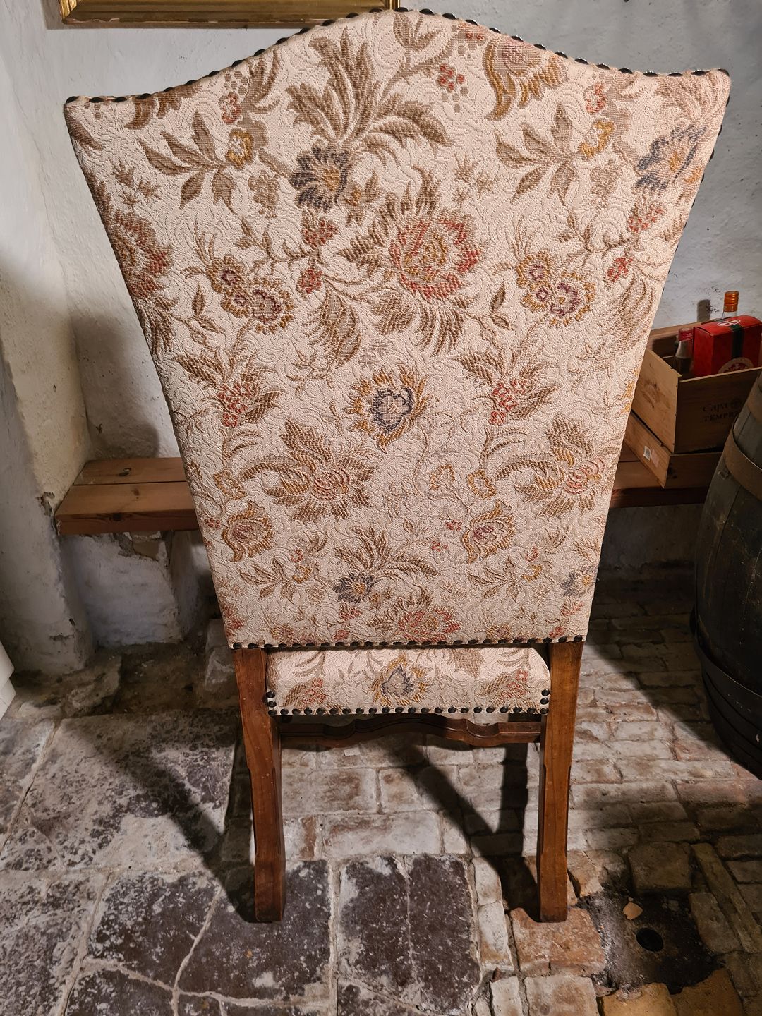 Flot gammel kongestol i eg og stofbeklædt ryg og sæde. Fremstår stabil og velholdt uden nævneværdige brugsspor. HxBxD 135x77x70 cm. Siddehøjde 56 cm. Emne nummer: 80282
