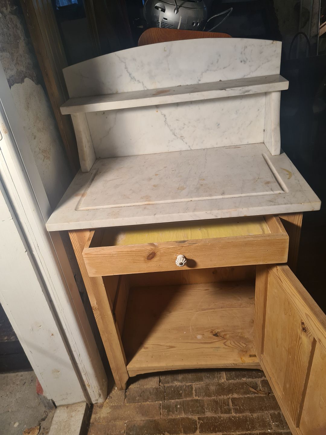 Servante i fyr med mamorplade og opsats. Fremstår pæn og velholdt uden nævneværdige brugsspor. HxBxD 101x63x42 cm. Emne nummer: 80295